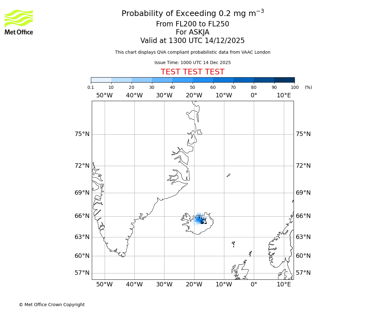 Probability of exceeding 0.2 milligrams per metre cubed. From 200 to 250 for ASKJA. Valid at 1000 UTC 14/12/2025