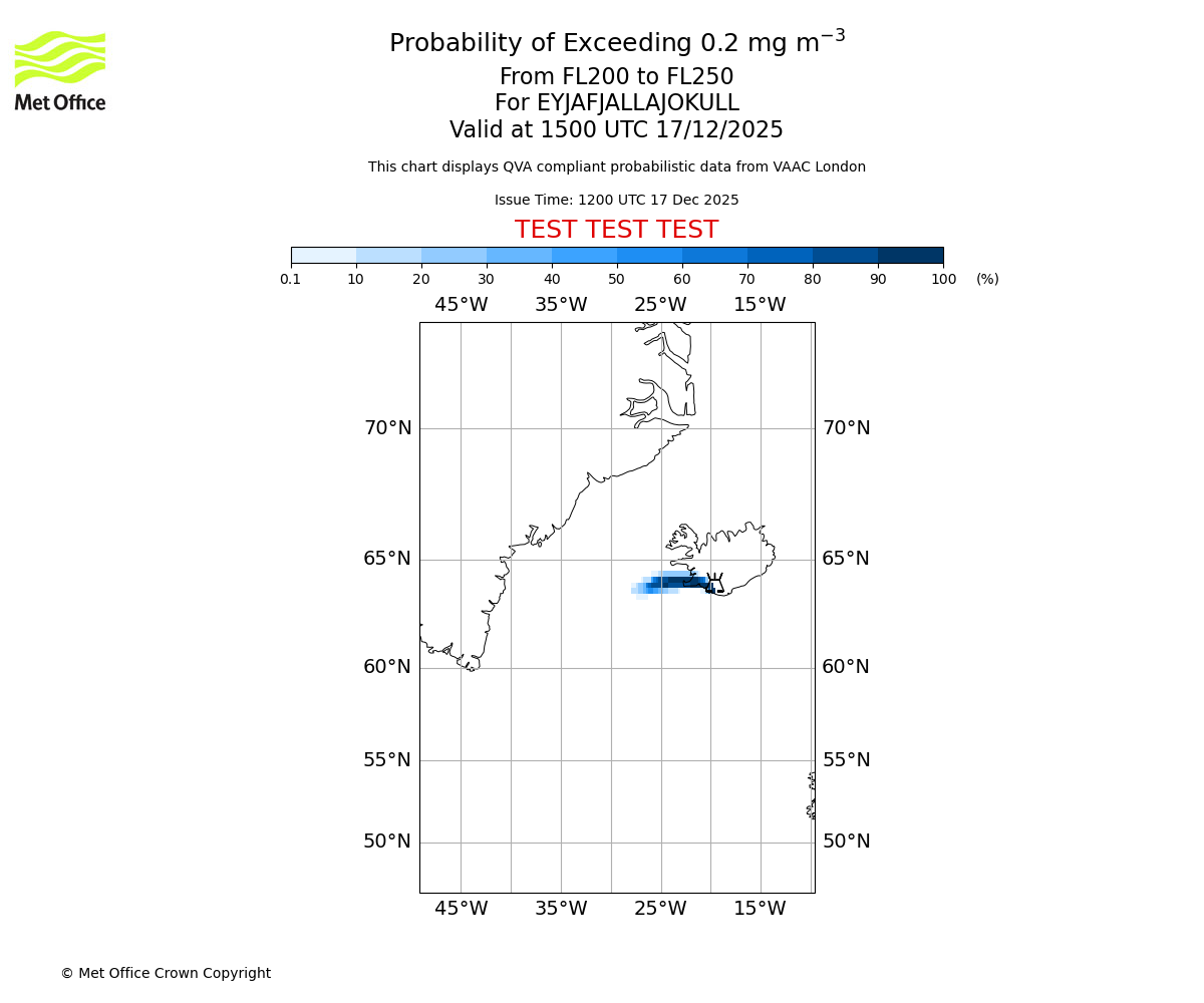 Probability of exceeding 0.2 milligrams per metre cubed. From 200 to 250 for EYJAFJALLAJOKULL. Valid at 1200 UTC 17/12/2025