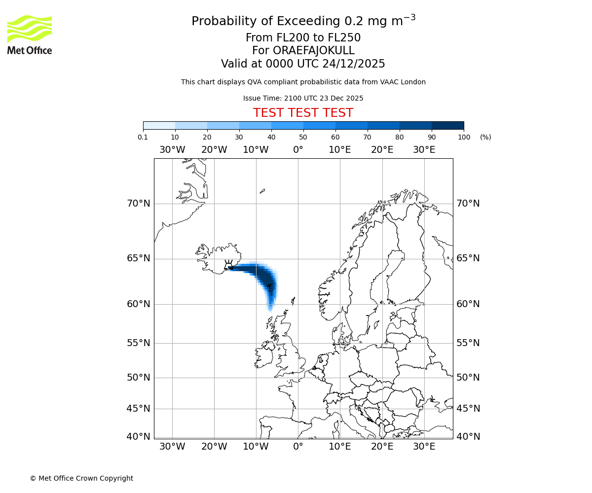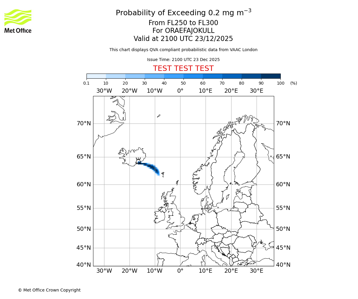 Probability of exceeding 0.2 milligrams per metre cubed. From 200 to 250 for ORAEFAJOKULL. Valid at 2100 UTC 23/12/2025