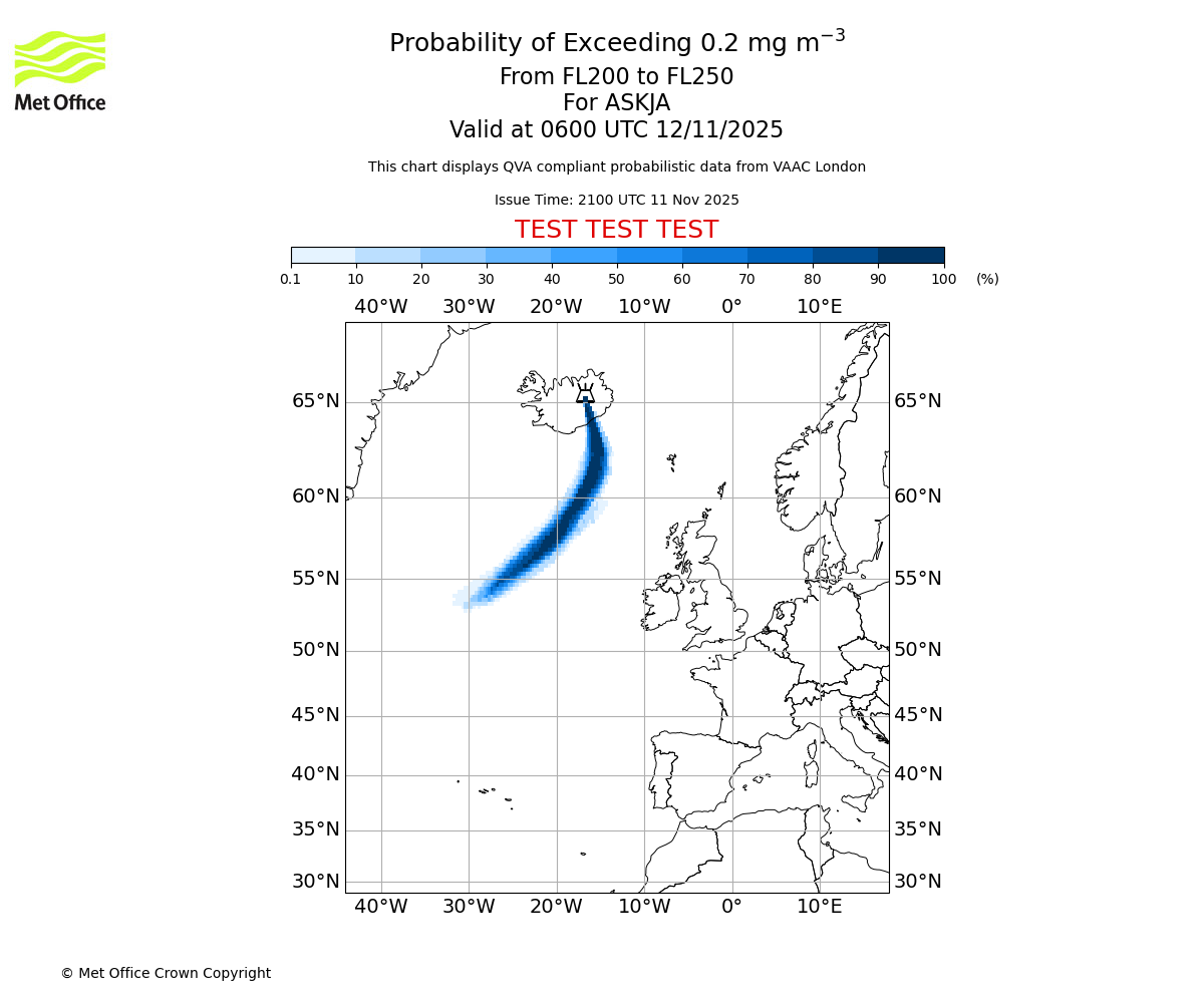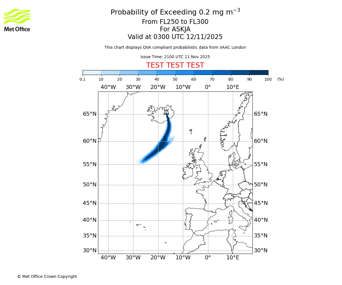 Probability of exceeding 0.2 milligrams per metre cubed. From 200 to 250 for ASKJA. Valid at 0300 UTC 12/11/2025