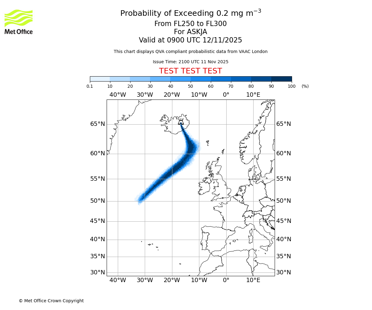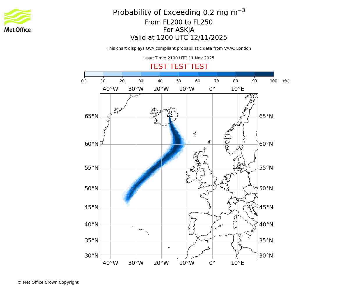 Probability of exceeding 0.2 milligrams per metre cubed. From 200 to 250 for ASKJA. Valid at 0900 UTC 12/11/2025