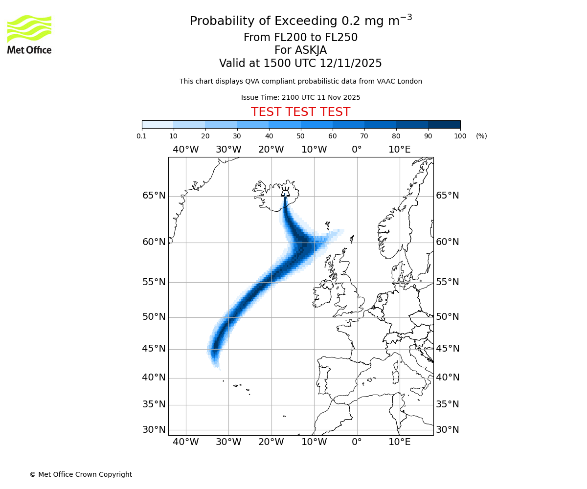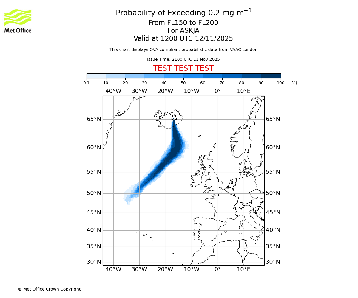 In accordance with ICAO Annex 3, Amendment 82 VAAC London will provide operational QVA forecasts from 27 November 2025 and these will be made available via a VAAC London QVA API information service. These charts are currently provided for test and evaluation purposes (not for operational use) until the introduction of the operational service.