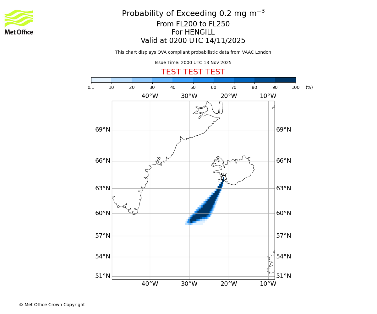 Modelled ash concentration from 000 to 200 for HENGILL. Valid at 2000 UTC 13/11/2025