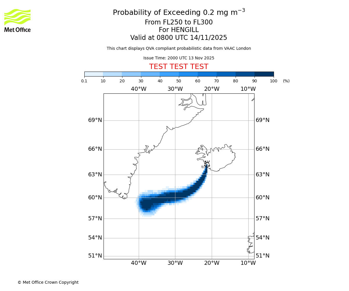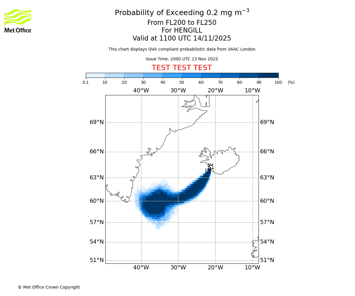 Probability of exceeding 0.2 milligrams per metre cubed. From 200 to 250 for HENGILL. Valid at 0800 UTC 14/11/2025