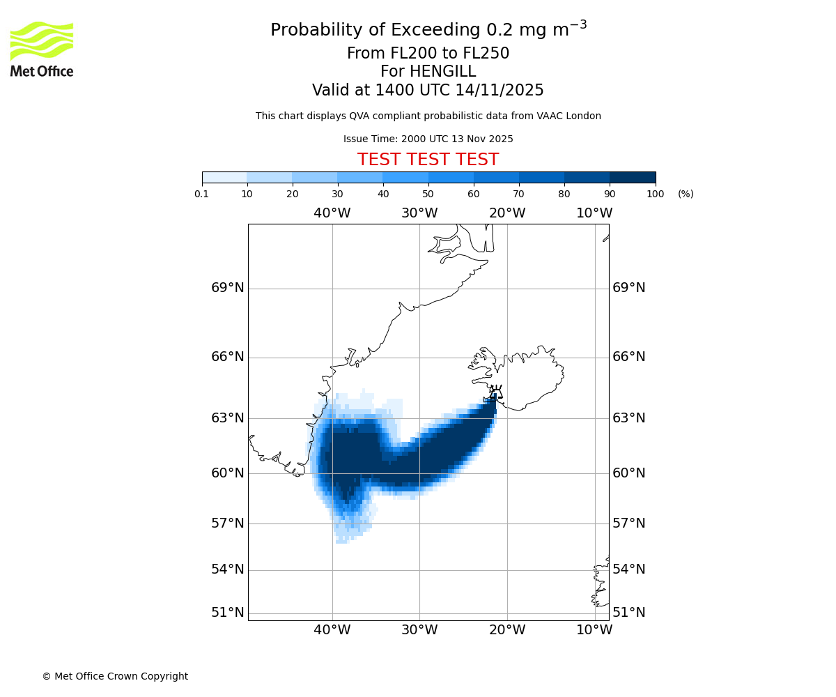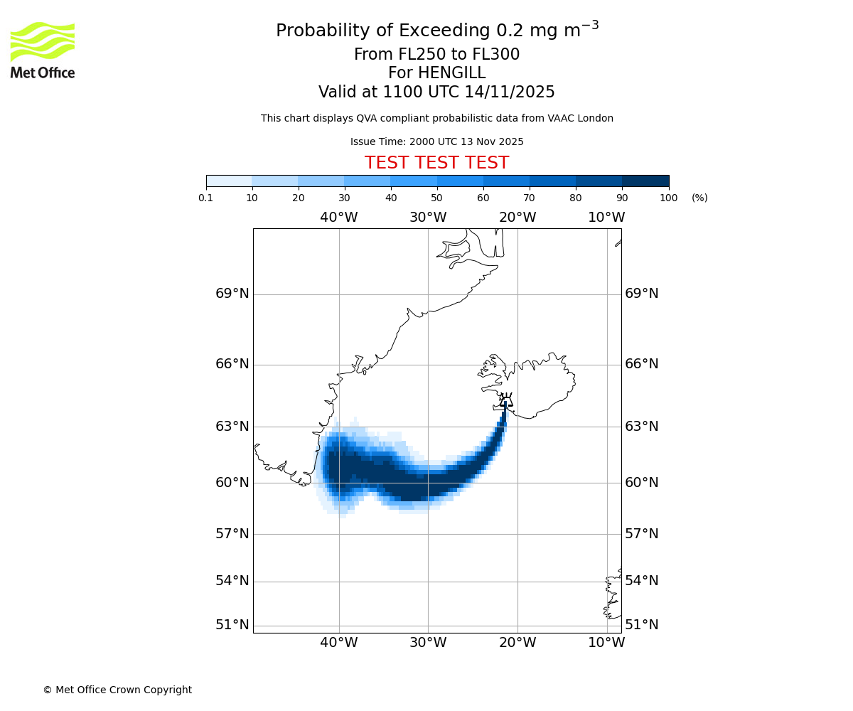 Probability of exceeding 0.2 milligrams per metre cubed. From 200 to 250 for HENGILL. Valid at 1100 UTC 14/11/2025