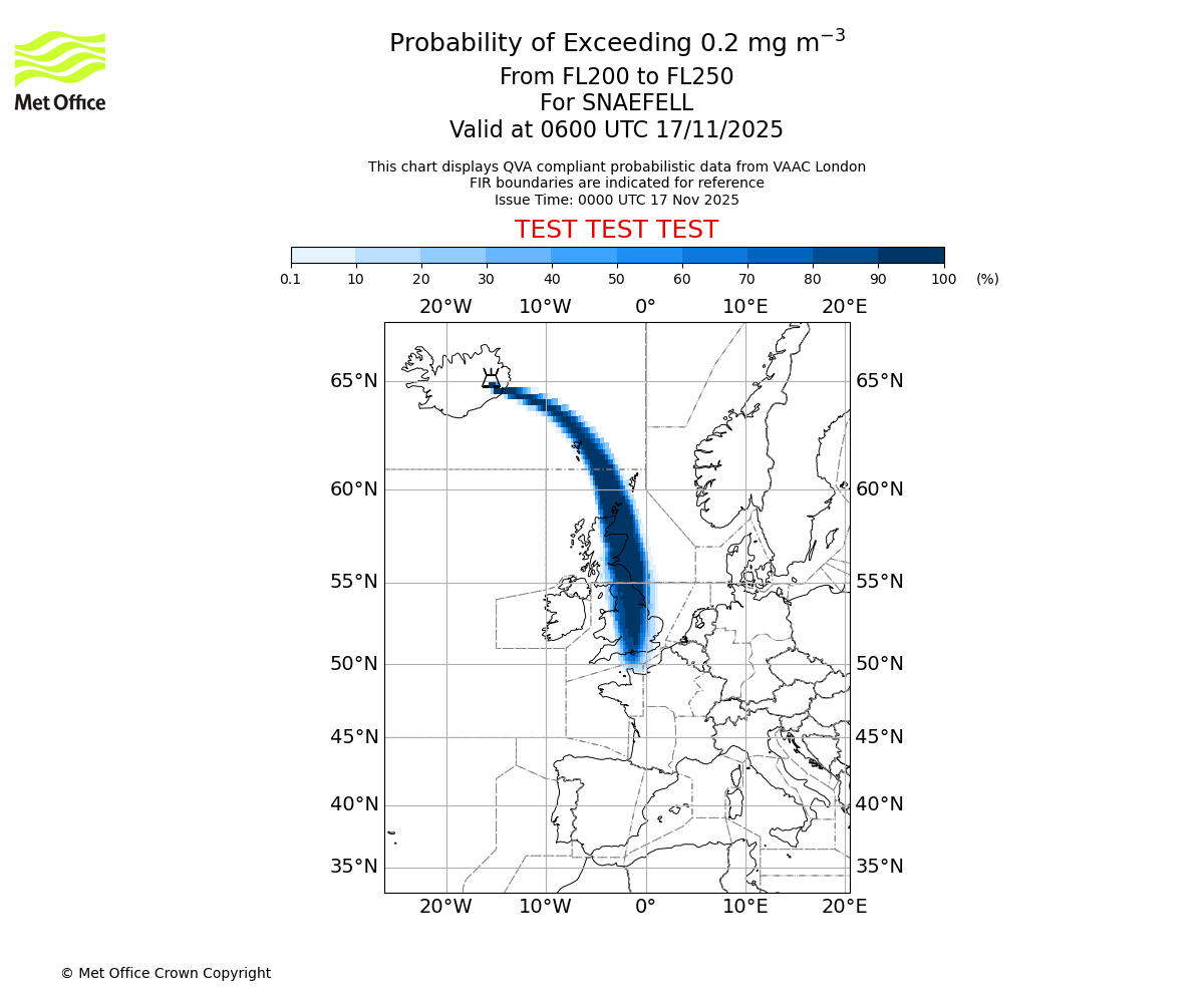 In accordance with ICAO Annex 3, Amendment 82 VAAC London will provide operational QVA forecasts from 27 November 2025 and these will be made available via a VAAC London QVA API information service. These charts are currently provided for test and evaluation purposes (not for operational use) until the introduction of the operational service.