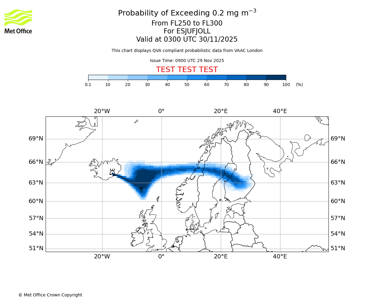 Quantitative Volcanic Ash charts (QVA) are produced in accordance with International Civil Aviation Organization (ICAO) Annex 3 requirements and are provided as well as the London Volcanic Ash Advisory Graphics (VAG) and Advisories (VAA). The lowest QVA threshold (0.2 mg/m³) matches to the areas depicted in the VAA and VAG. Both expected ash concentration and probabilistic forecast information is provided in the chart viewer below for eruptions occurring in the London Volcanic Ash Advisory Centre (VAAC) area of responsibility.