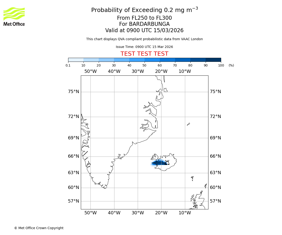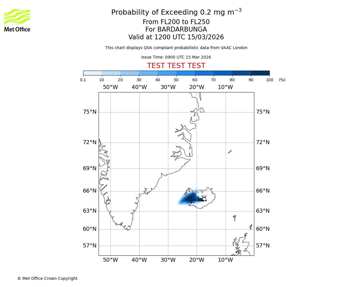 Probability of exceeding 0.2 milligrams per metre cubed. From 200 to 250 for BARDARBUNGA. Valid at 0900 UTC 15/03/2026