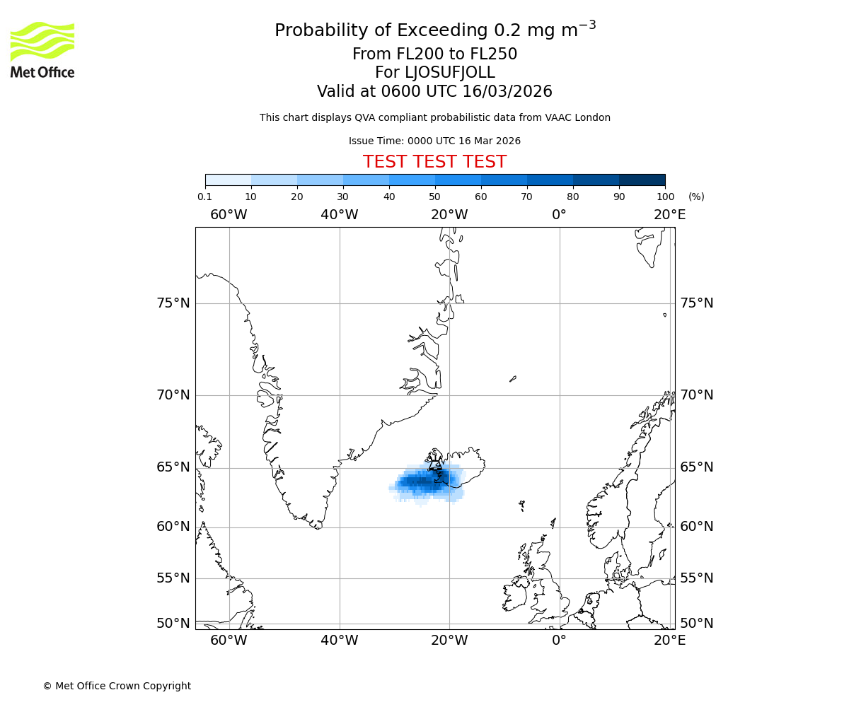Modelled ash concentration from 000 to 200 for LJOSUFJOLL. Valid at 0000 UTC 16/03/2026