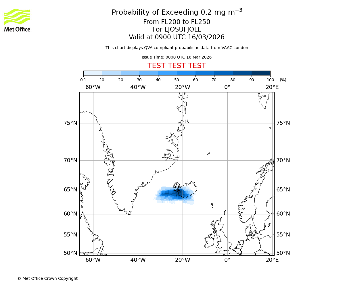 Modelled ash concentration from 000 to 200 for LJOSUFJOLL. Valid at 0000 UTC 16/03/2026