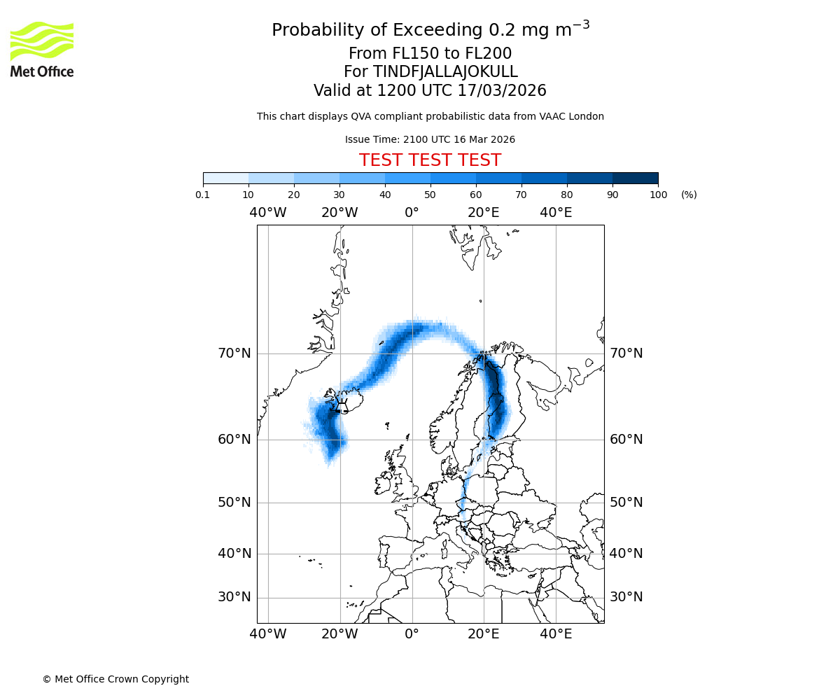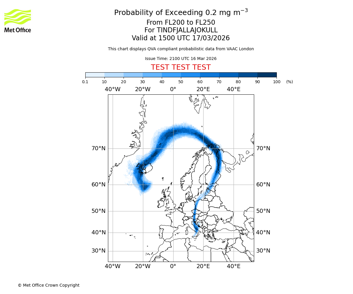 Modelled ash concentration from 000 to 200 for TINDFJALLAJOKULL. Valid at 2100 UTC 16/03/2026