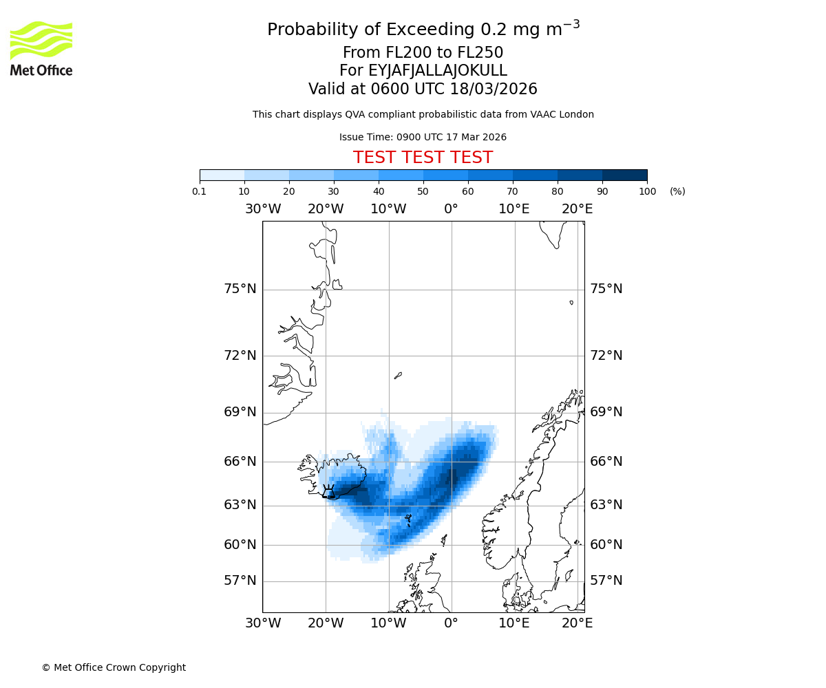 Probability of exceeding 0.2 milligrams per metre cubed. From 200 to 250 for EYJAFJALLAJOKULL. Valid at 0300 UTC 18/03/2026