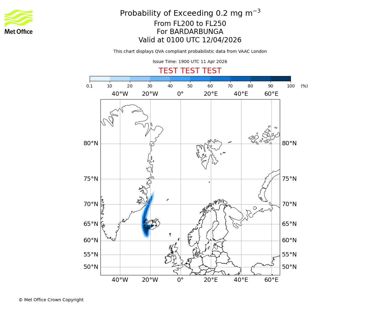 Modelled ash concentration from 000 to 200 for BARDARBUNGA. Valid at 1900 UTC 11/04/2026