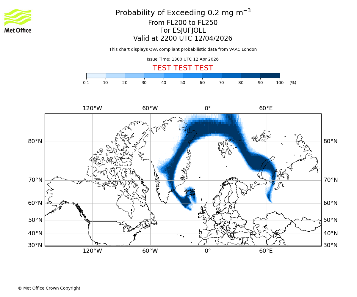 Modelled ash concentration from 000 to 200 for ESJUFJOLL. Valid at 1300 UTC 12/04/2026