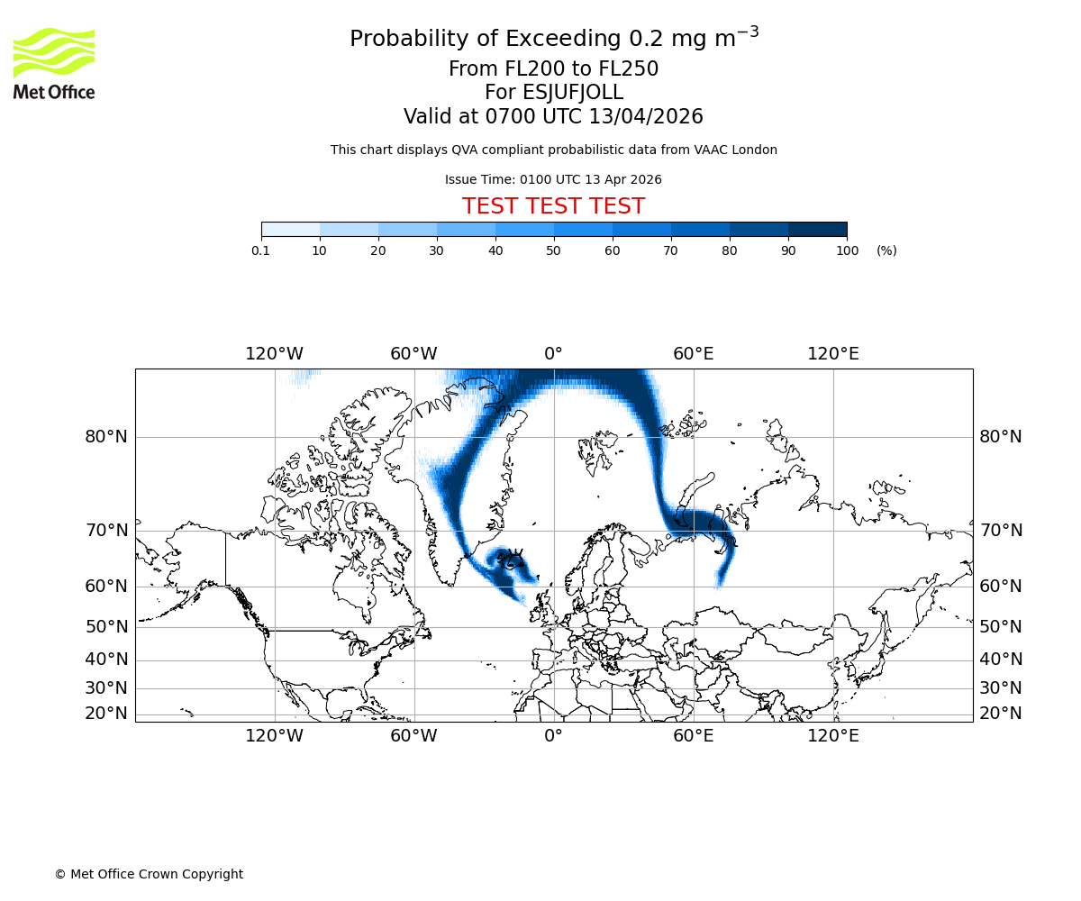 Quantitative Volcanic Ash charts (QVA) are produced in accordance with International Civil Aviation Organization (ICAO) Annex 3 requirements and are provided as well as the London Volcanic Ash Advisory Graphics (VAG) and Advisories (VAA). The lowest QVA threshold (0.2 mg/m³) matches to the areas depicted in the VAA and VAG. Both expected ash concentration and probabilistic forecast information is provided in the chart viewer below for eruptions occurring in the London Volcanic Ash Advisory Centre (VAAC) area of responsibility.