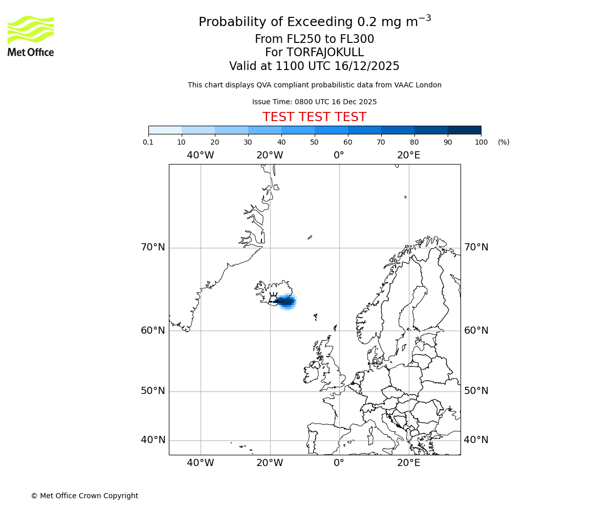 Probability of exceeding 0.2 milligrams per metre cubed. From 250 to 300 for TORFAJOKULL. Valid at 0800 UTC 16/12/2025