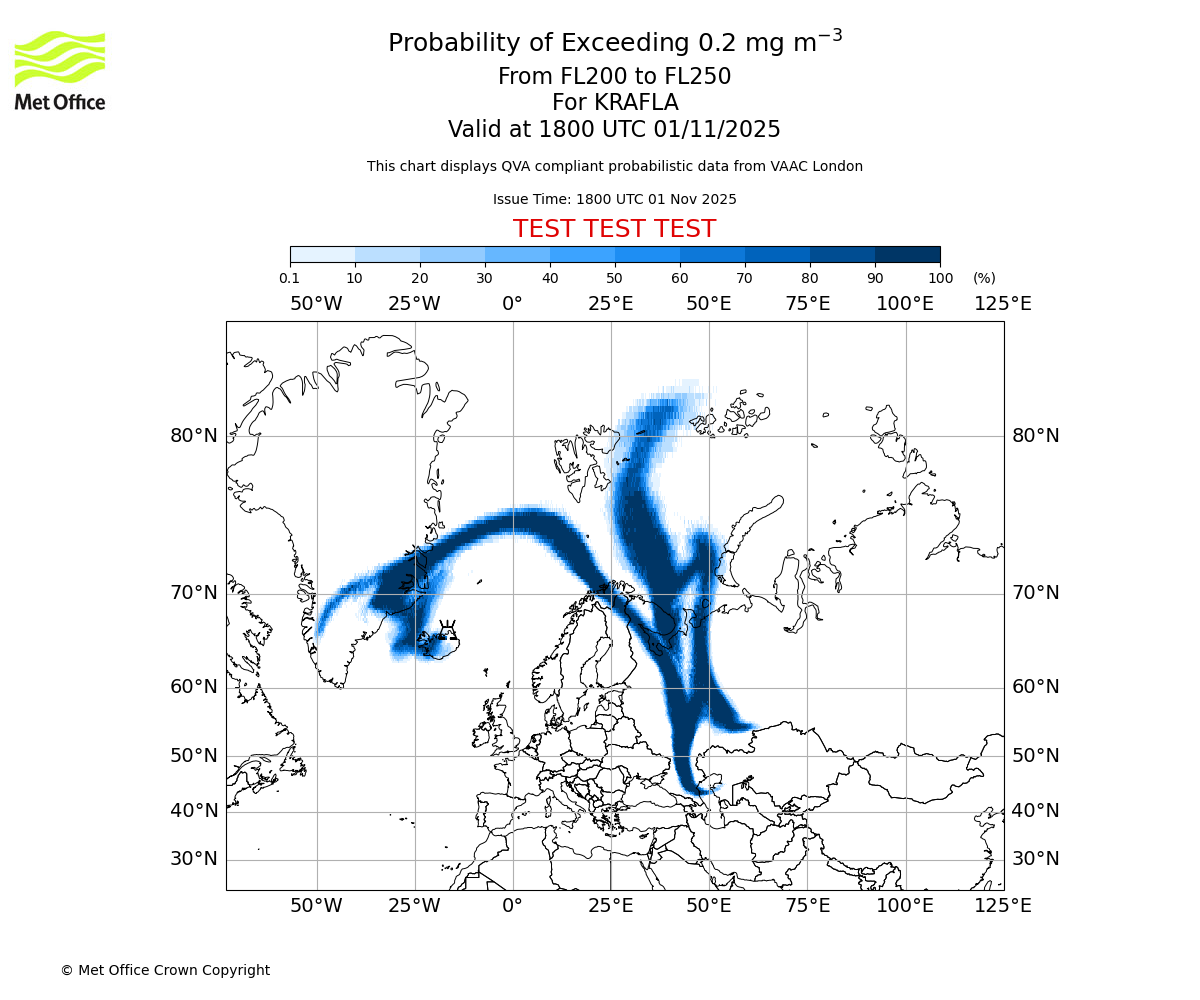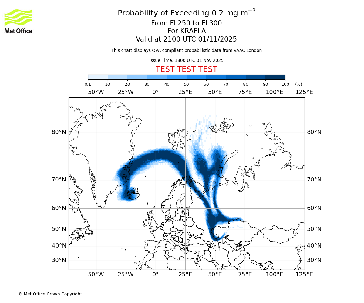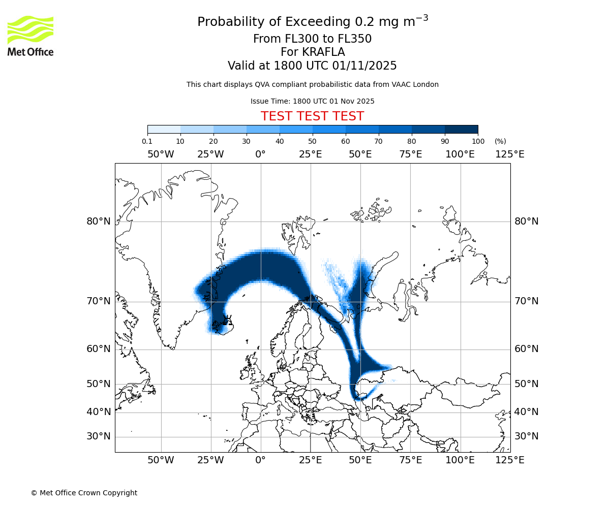 In accordance with ICAO Annex 3, Amendment 82 VAAC London will provide operational QVA forecasts from 27 November 2025 and these will be made available via a VAAC London QVA API information service. These charts are currently provided for test and evaluation purposes (not for operational use) until the introduction of the operational service.