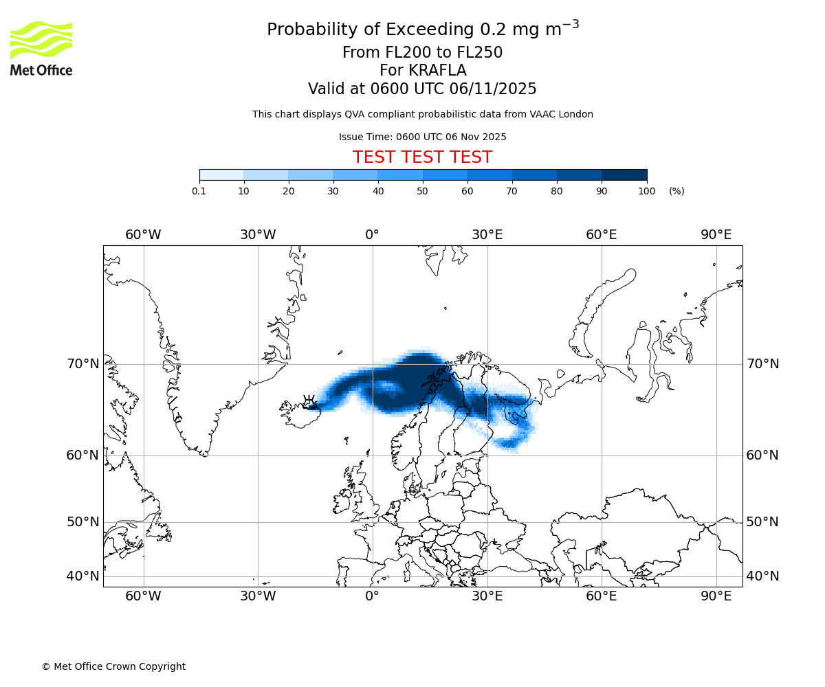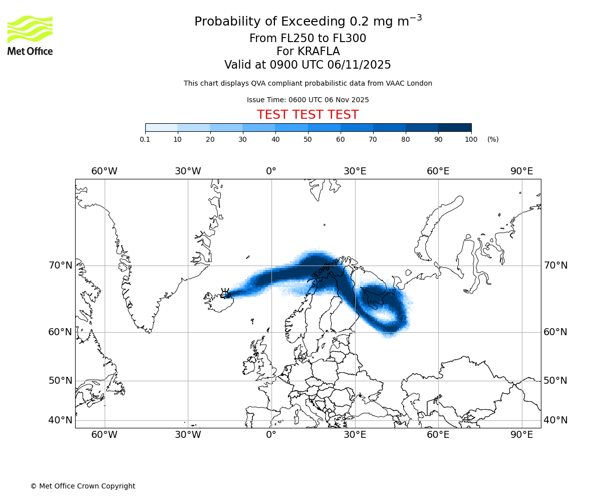 In accordance with ICAO Annex 3, Amendment 82 VAAC London will provide operational QVA forecasts from 27 November 2025 and these will be made available via a VAAC London QVA API information service. These charts are currently provided for test and evaluation purposes (not for operational use) until the introduction of the operational service.