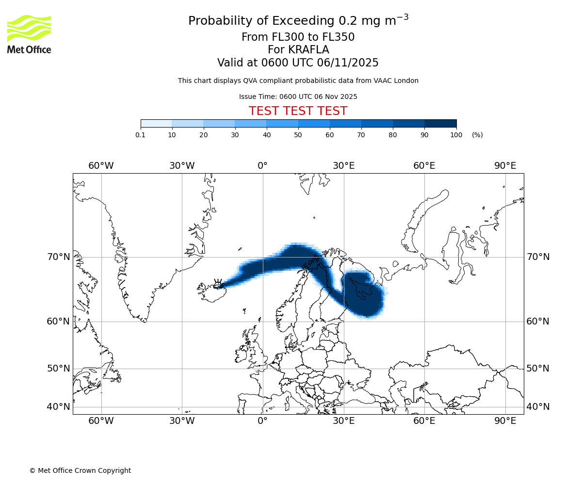 Probability of exceeding 0.2 milligrams per metre cubed. From 250 to 300 for KRAFLA. Valid at 0600 UTC 06/11/2025