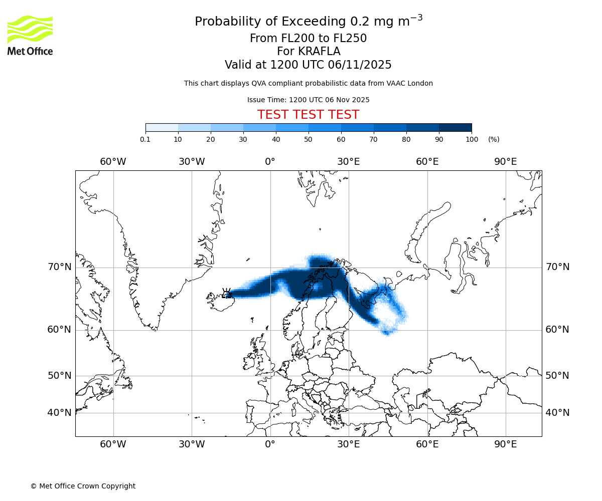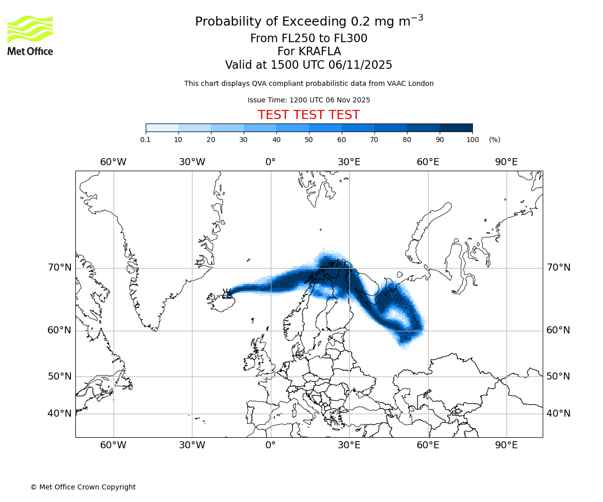 In accordance with ICAO Annex 3, Amendment 82 VAAC London will provide operational QVA forecasts from 27 November 2025 and these will be made available via a VAAC London QVA API information service. These charts are currently provided for test and evaluation purposes (not for operational use) until the introduction of the operational service.