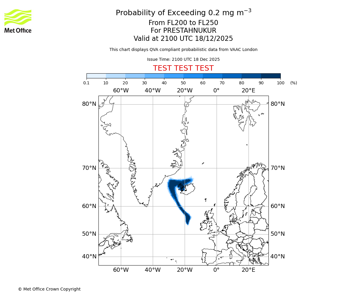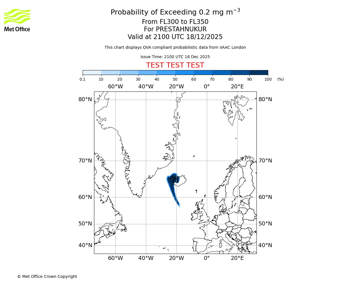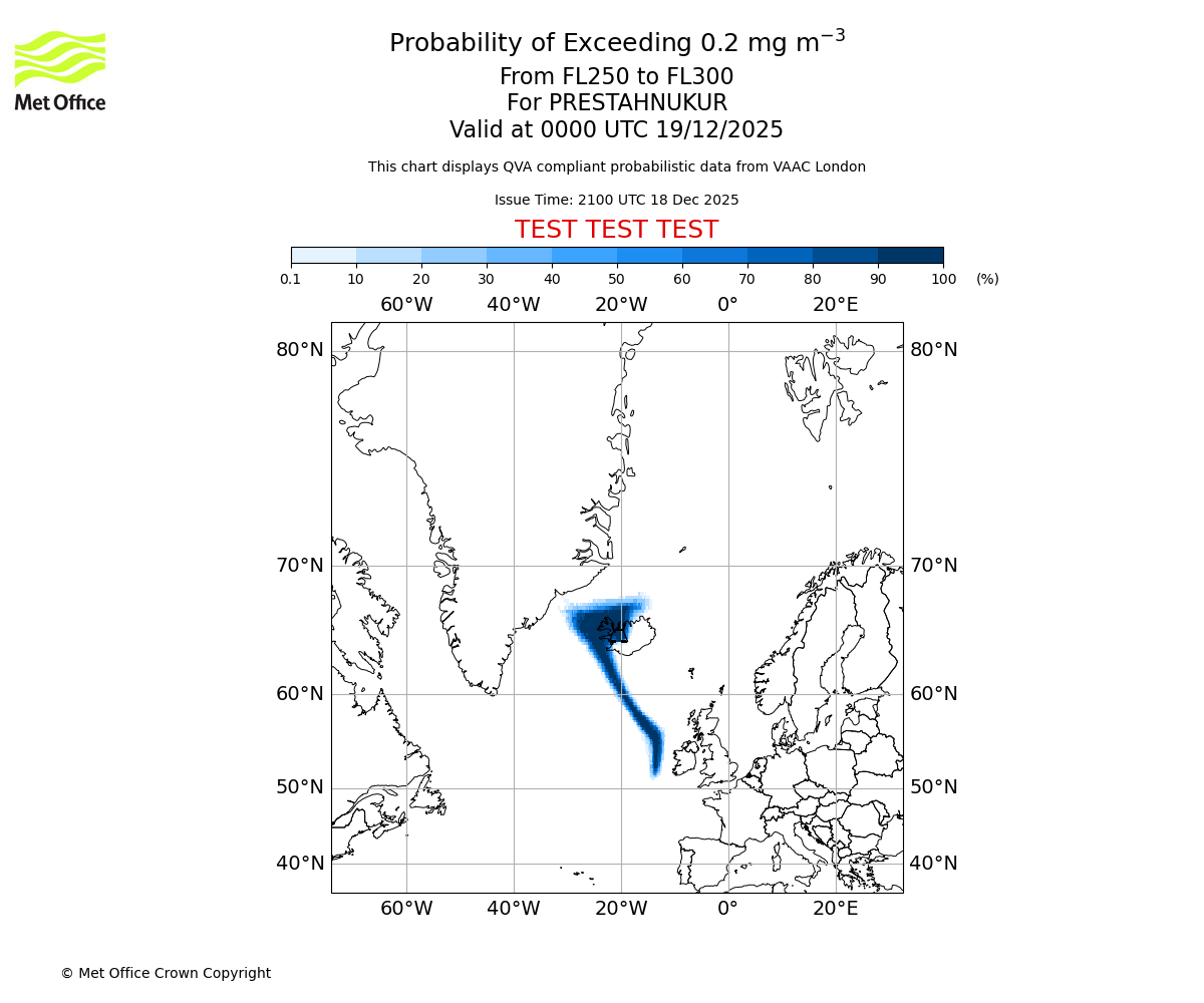Probability of exceeding 0.2 milligrams per metre cubed. From 250 to 300 for PRESTAHNUKUR. Valid at 2100 UTC 18/12/2025
