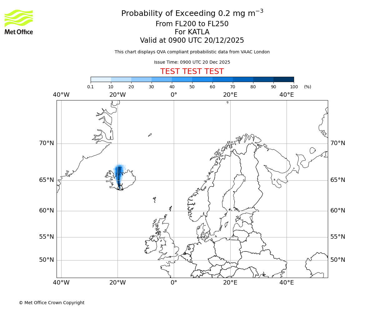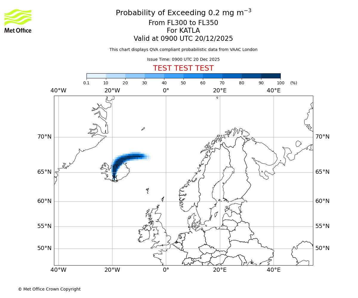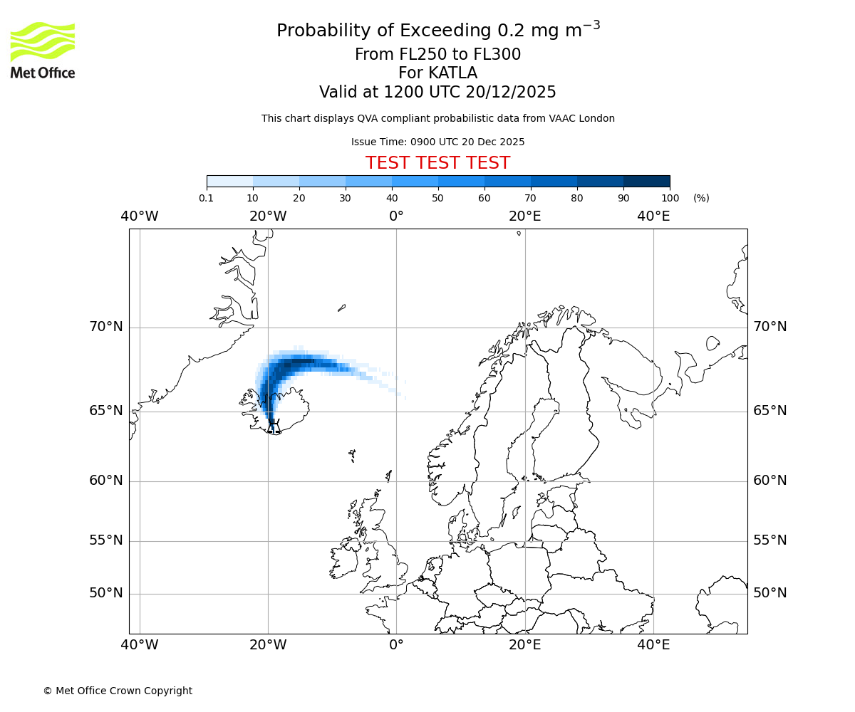 Probability of exceeding 0.2 milligrams per metre cubed. From 250 to 300 for KATLA. Valid at 0900 UTC 20/12/2025