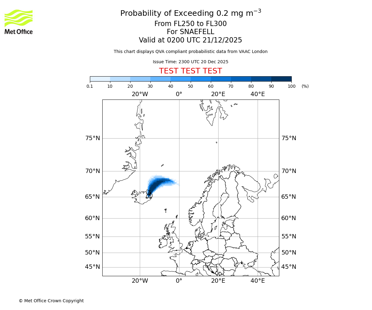 Probability of exceeding 0.2 milligrams per metre cubed. From 250 to 300 for SNAEFELL. Valid at 2300 UTC 20/12/2025