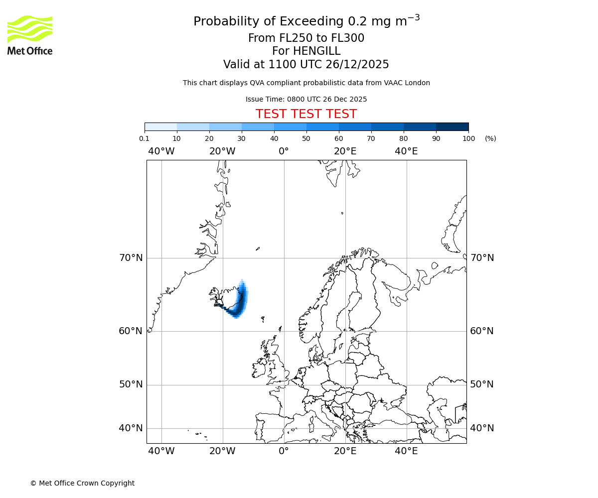 Probability of exceeding 0.2 milligrams per metre cubed. From 250 to 300 for HENGILL. Valid at 0800 UTC 26/12/2025