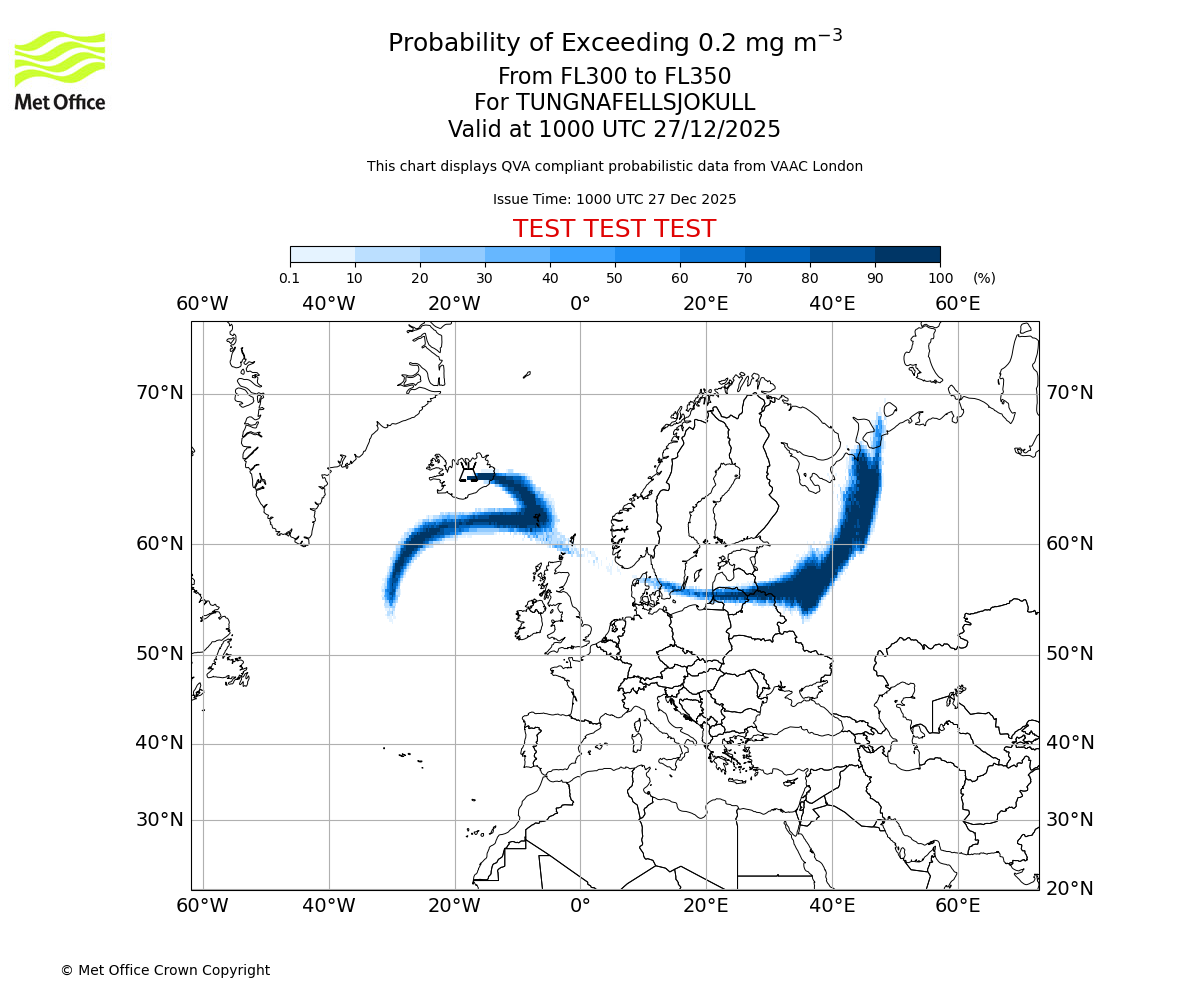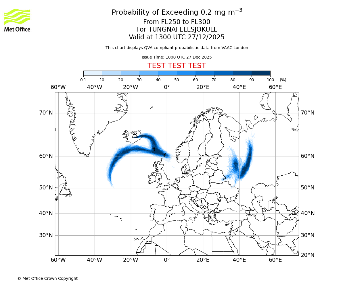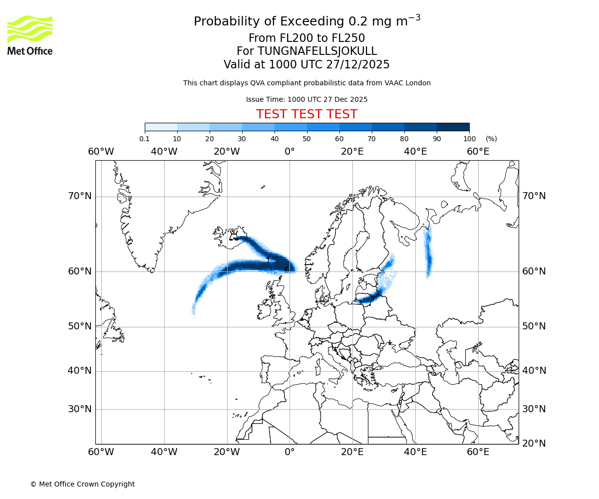 Modelled ash concentration from 000 to 200 for TUNGNAFELLSJOKULL. Valid at 1000 UTC 27/12/2025