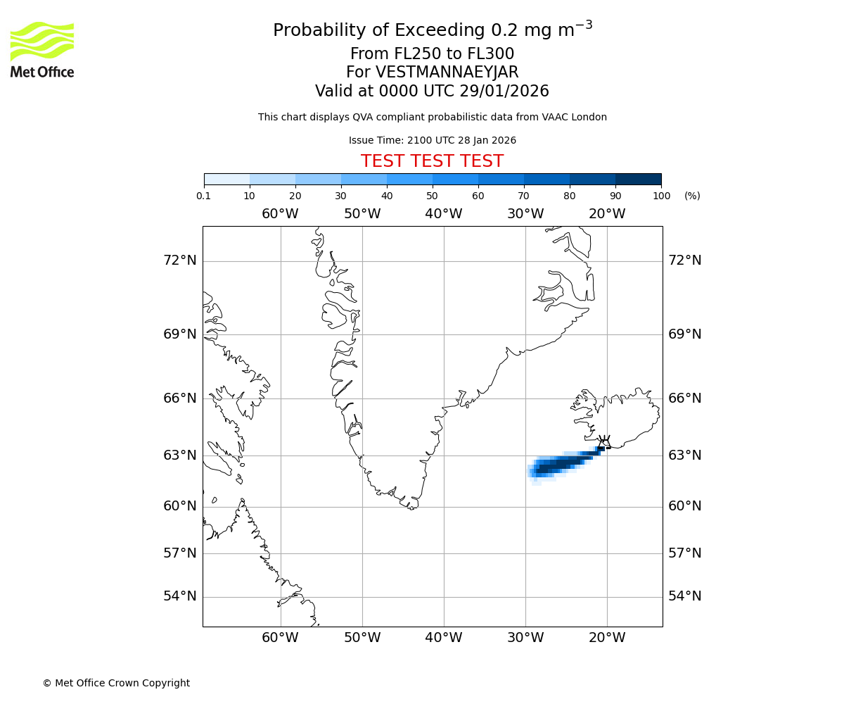 Probability of exceeding 0.2 milligrams per metre cubed. From 250 to 300 for VESTMANNAEYJAR. Valid at 2100 UTC 28/01/2026