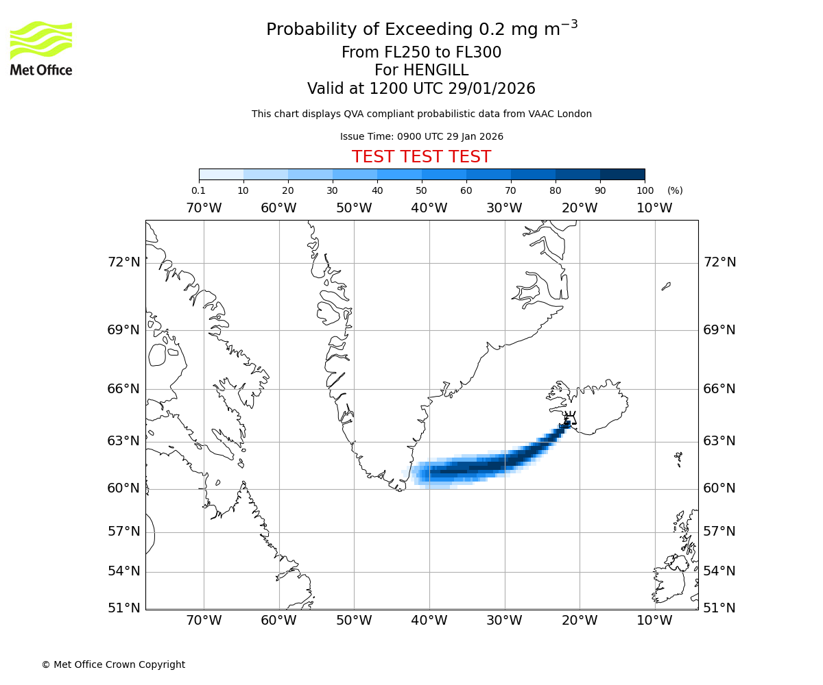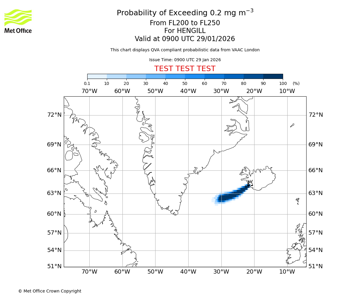 Probability of exceeding 0.2 milligrams per metre cubed. From 250 to 300 for HENGILL. Valid at 0900 UTC 29/01/2026