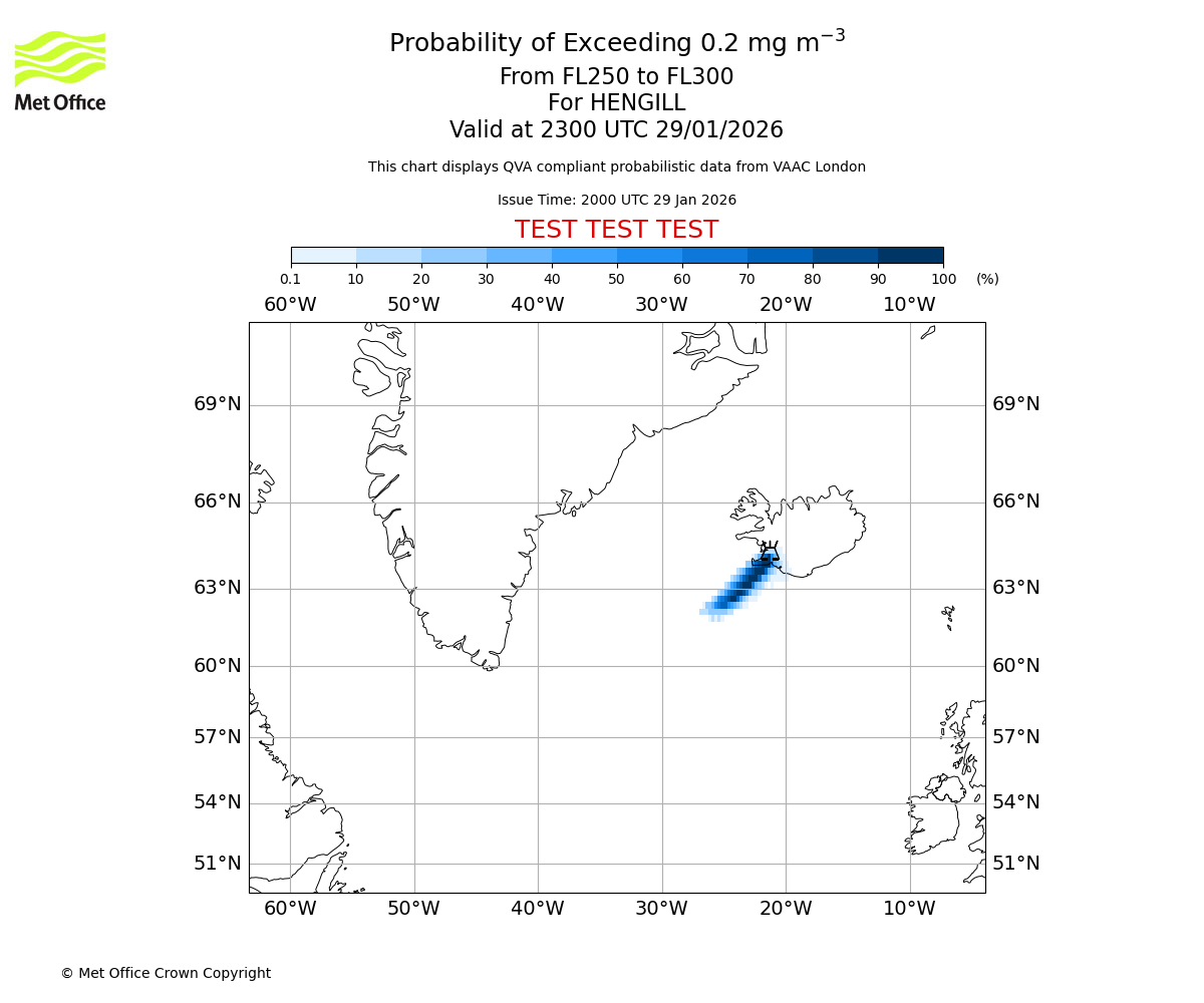 Probability of exceeding 0.2 milligrams per metre cubed. From 250 to 300 for HENGILL. Valid at 2000 UTC 29/01/2026