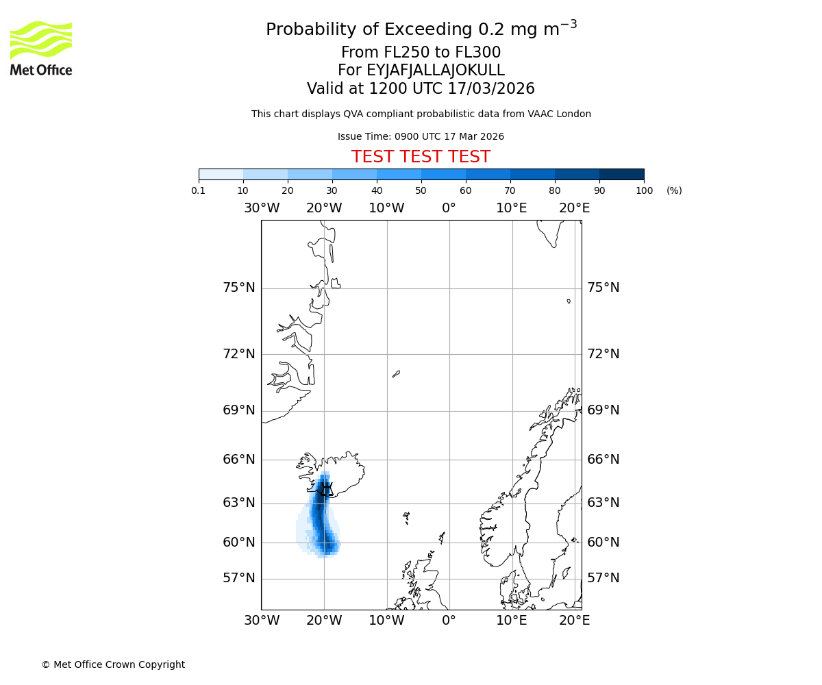 Probability of exceeding 0.2 milligrams per metre cubed. From 250 to 300 for EYJAFJALLAJOKULL. Valid at 0900 UTC 17/03/2026