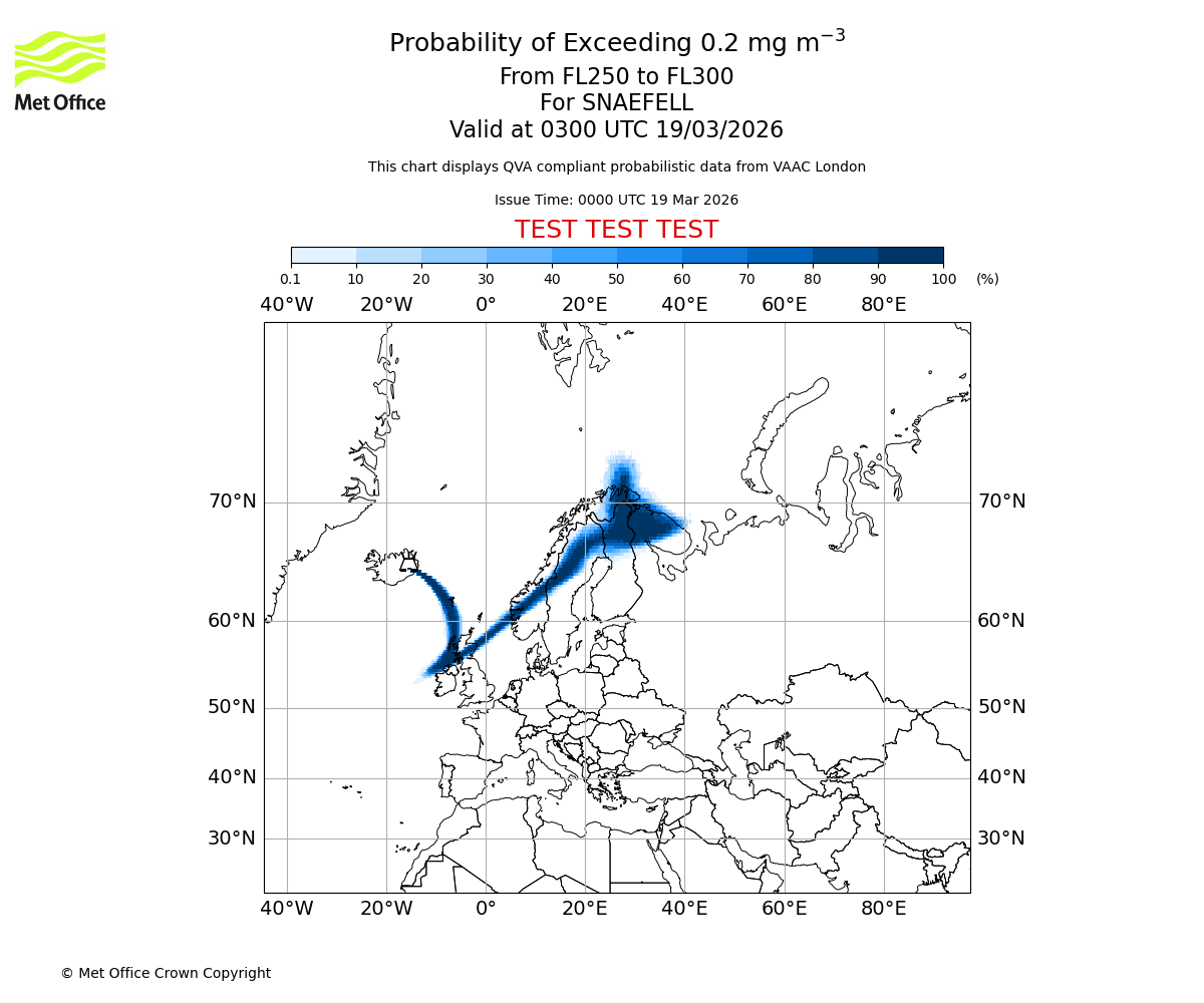 Quantitative Volcanic Ash charts (QVA) are produced in accordance with International Civil Aviation Organization (ICAO) Annex 3 requirements and are provided as well as the London Volcanic Ash Advisory Graphics (VAG) and Advisories (VAA). The lowest QVA threshold (0.2 mg/m³) matches to the areas depicted in the VAA and VAG. Both expected ash concentration and probabilistic forecast information is provided in the chart viewer below for eruptions occurring in the London Volcanic Ash Advisory Centre (VAAC) area of responsibility.