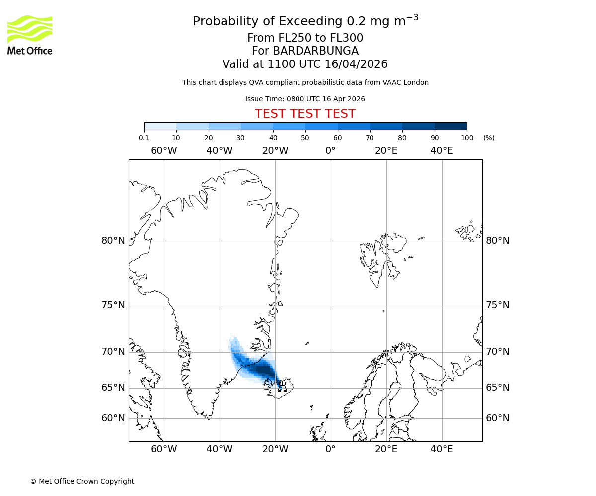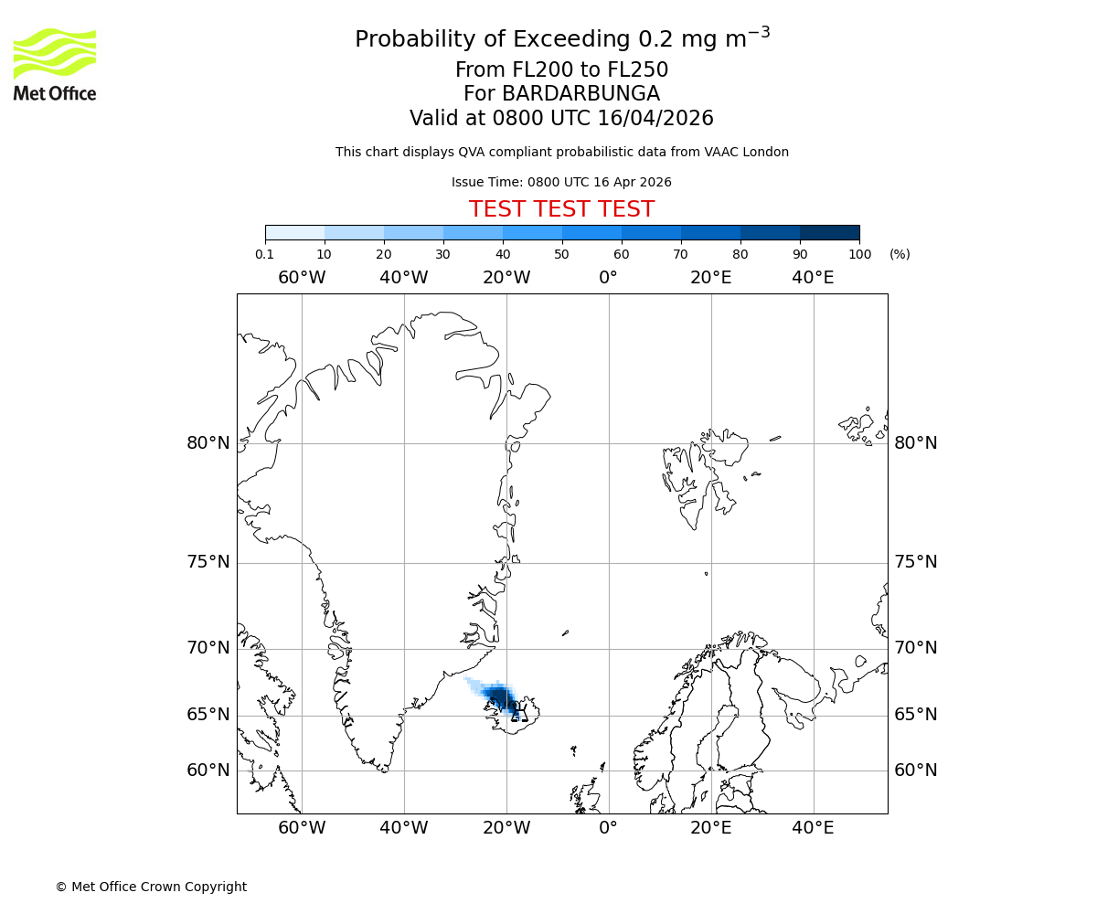 Probability of exceeding 0.2 milligrams per metre cubed. From 250 to 300 for BARDARBUNGA. Valid at 0800 UTC 16/04/2026