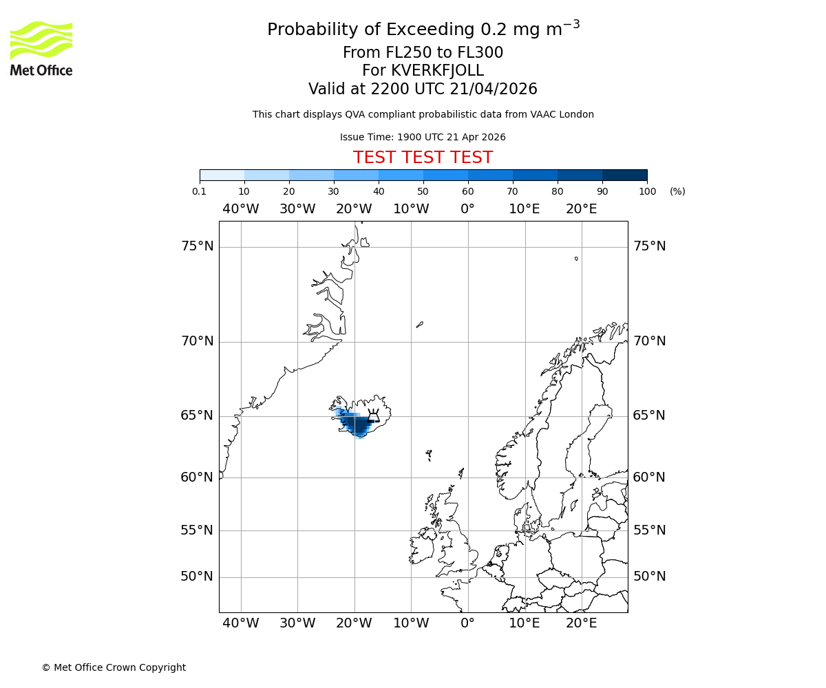 Modelled ash concentration from 000 to 200 for KVERKFJOLL. Valid at 1900 UTC 21/04/2026