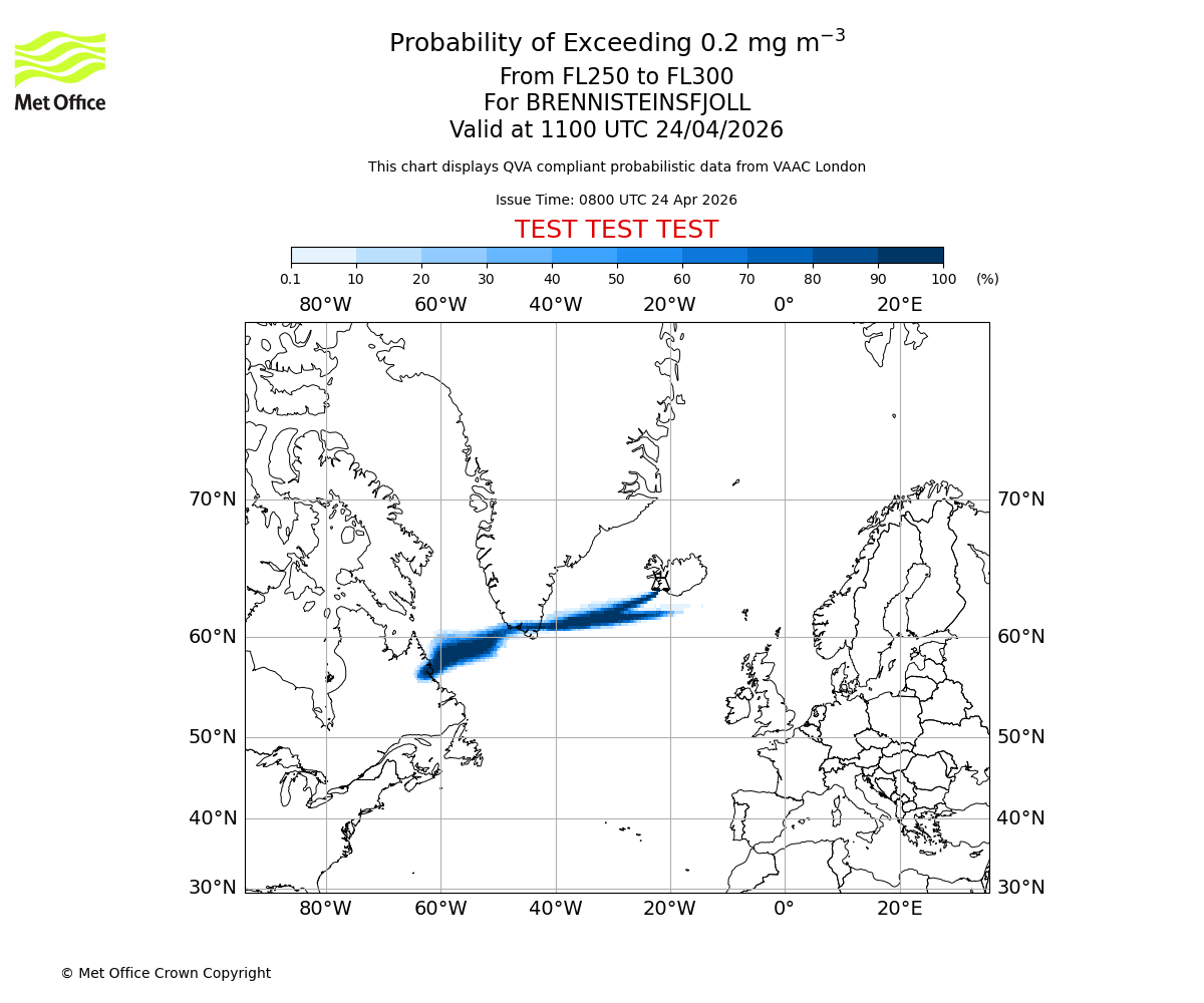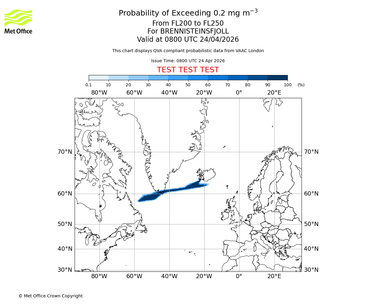 Quantitative Volcanic Ash charts (QVA) are produced in accordance with International Civil Aviation Organization (ICAO) Annex 3 requirements and are provided as well as the London Volcanic Ash Advisory Graphics (VAG) and Advisories (VAA). The lowest QVA threshold (0.2 mg/m³) matches to the areas depicted in the VAA and VAG. Both expected ash concentration and probabilistic forecast information is provided in the chart viewer below for eruptions occurring in the London Volcanic Ash Advisory Centre (VAAC) area of responsibility.
