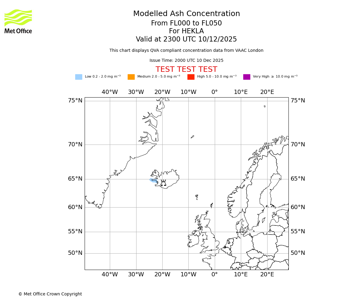 Modelled ash concentration from 000 to 050 for HEKLA. Valid at 2000 UTC 10/12/2025