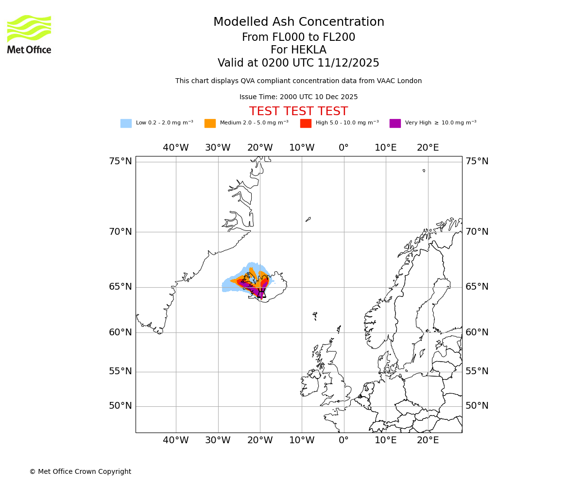 Modelled ash concentration from 000 to 200 for HEKLA. Valid at 2000 UTC 10/12/2025