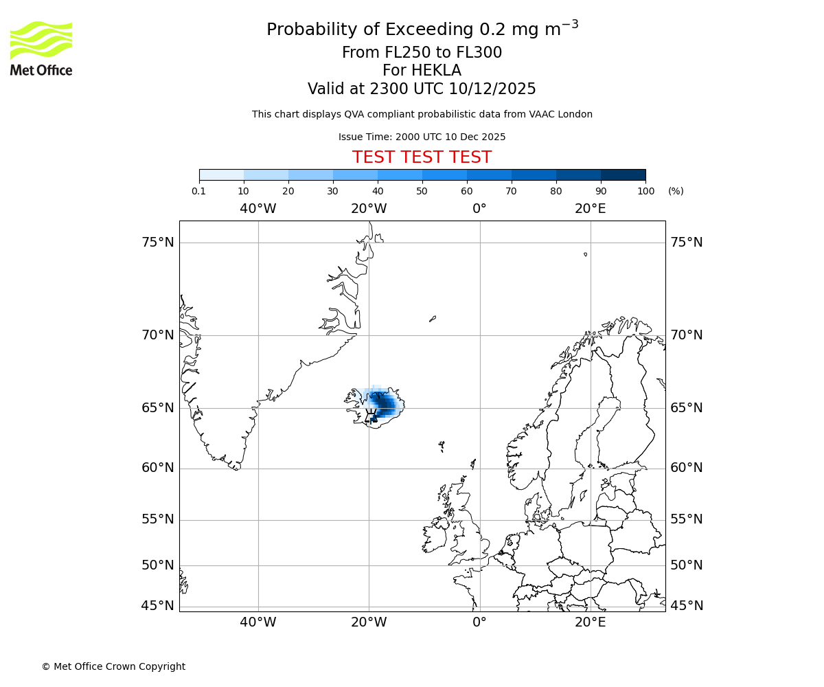 Probability of exceeding 0.2 milligrams per metre cubed. From 250 to 300 for HEKLA. Valid at 2000 UTC 10/12/2025