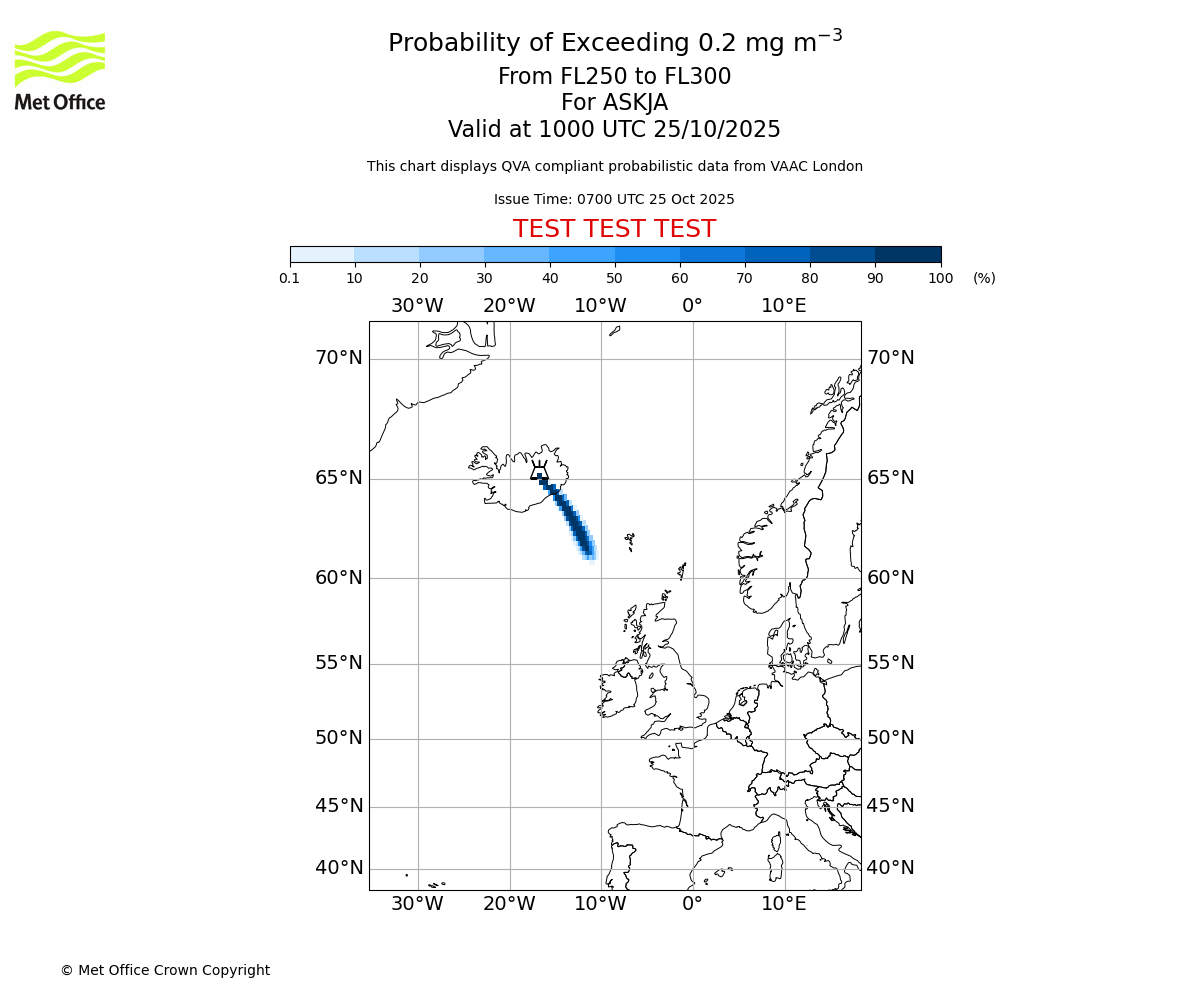 Probability of exceeding 0.2 milligrams per metre cubed. From 250 to 300 for ASKJA. Valid at 0700 UTC 25/10/2025