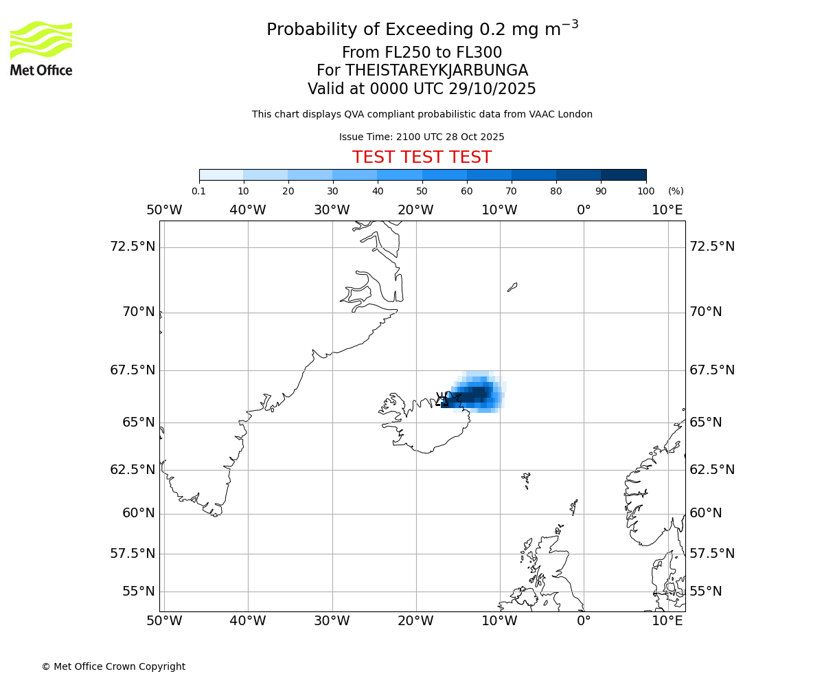 Probability of exceeding 0.2 milligrams per metre cubed. From 250 to 300 for THEISTAREYKJARBUNGA. Valid at 2100 UTC 28/10/2025
