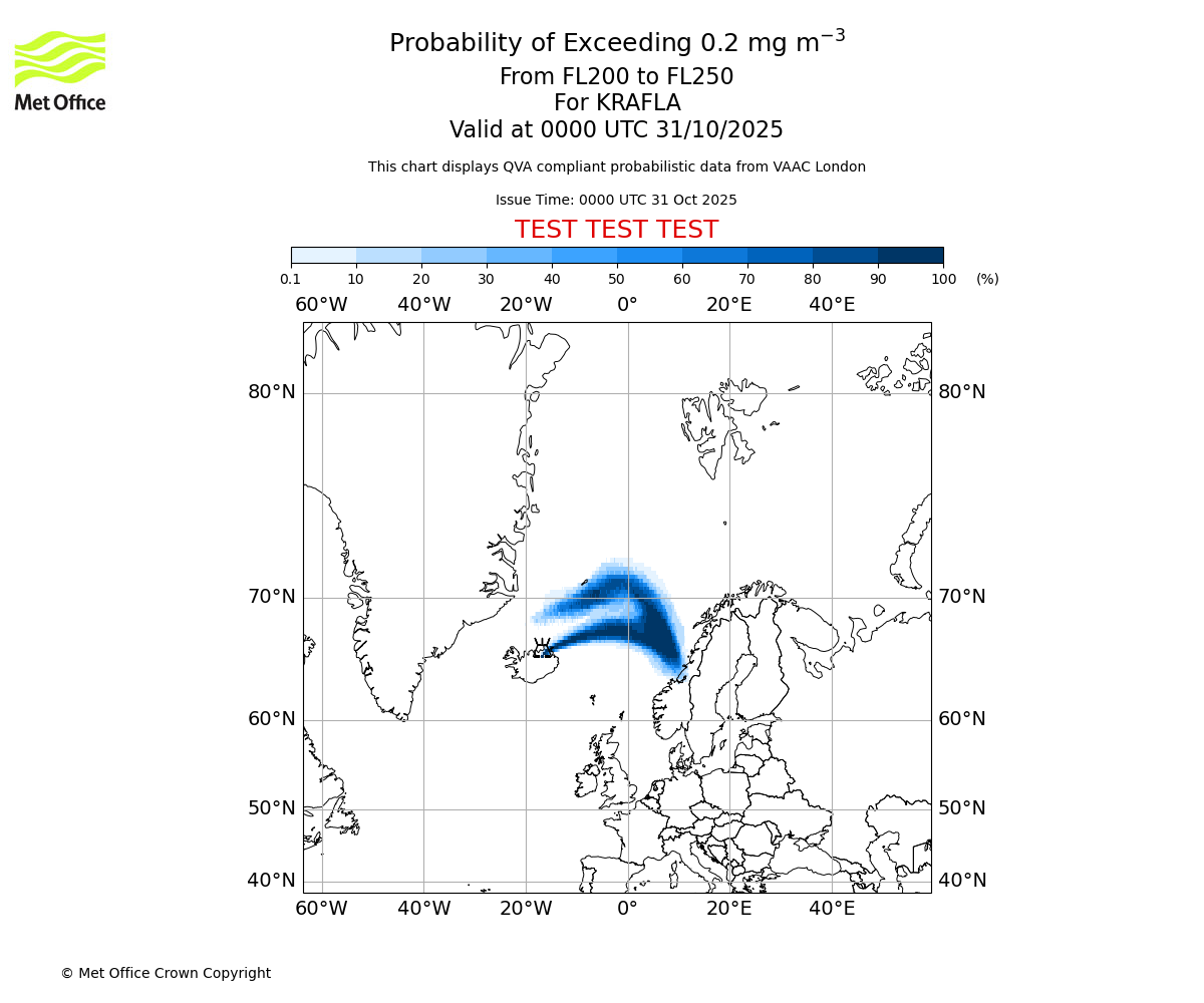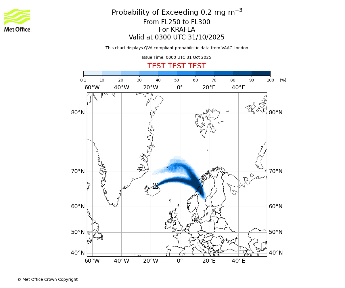 Probability of exceeding 0.2 milligrams per metre cubed. From 250 to 300 for KRAFLA. Valid at 0000 UTC 31/10/2025