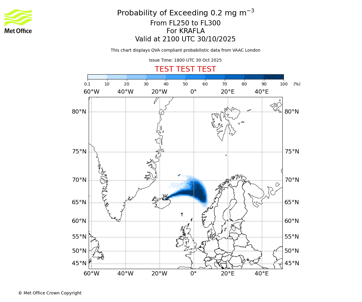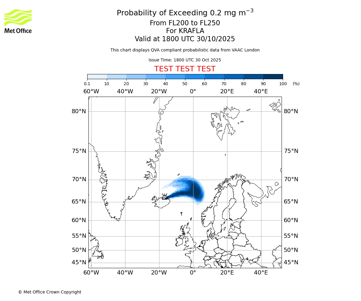 Probability of exceeding 0.2 milligrams per metre cubed. From 250 to 300 for KRAFLA. Valid at 1800 UTC 30/10/2025