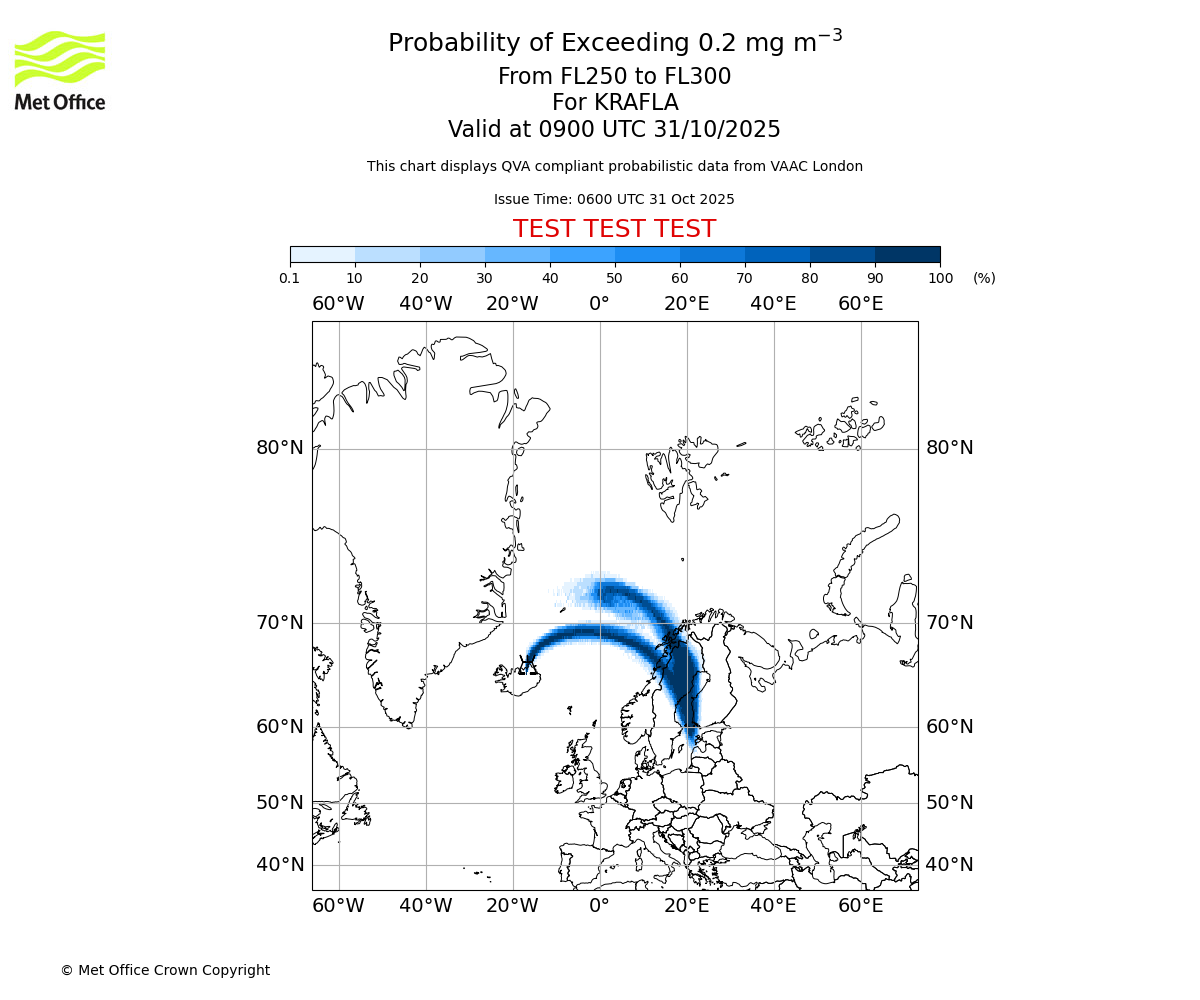 Probability of exceeding 0.2 milligrams per metre cubed. From 250 to 300 for KRAFLA. Valid at 0600 UTC 31/10/2025