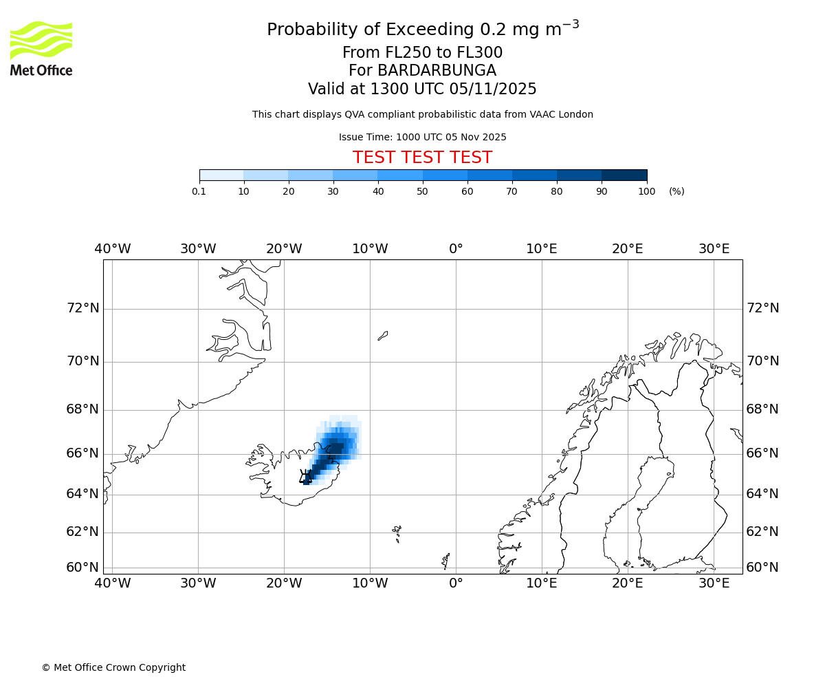 Probability of exceeding 0.2 milligrams per metre cubed. From 250 to 300 for BARDARBUNGA. Valid at 1000 UTC 05/11/2025