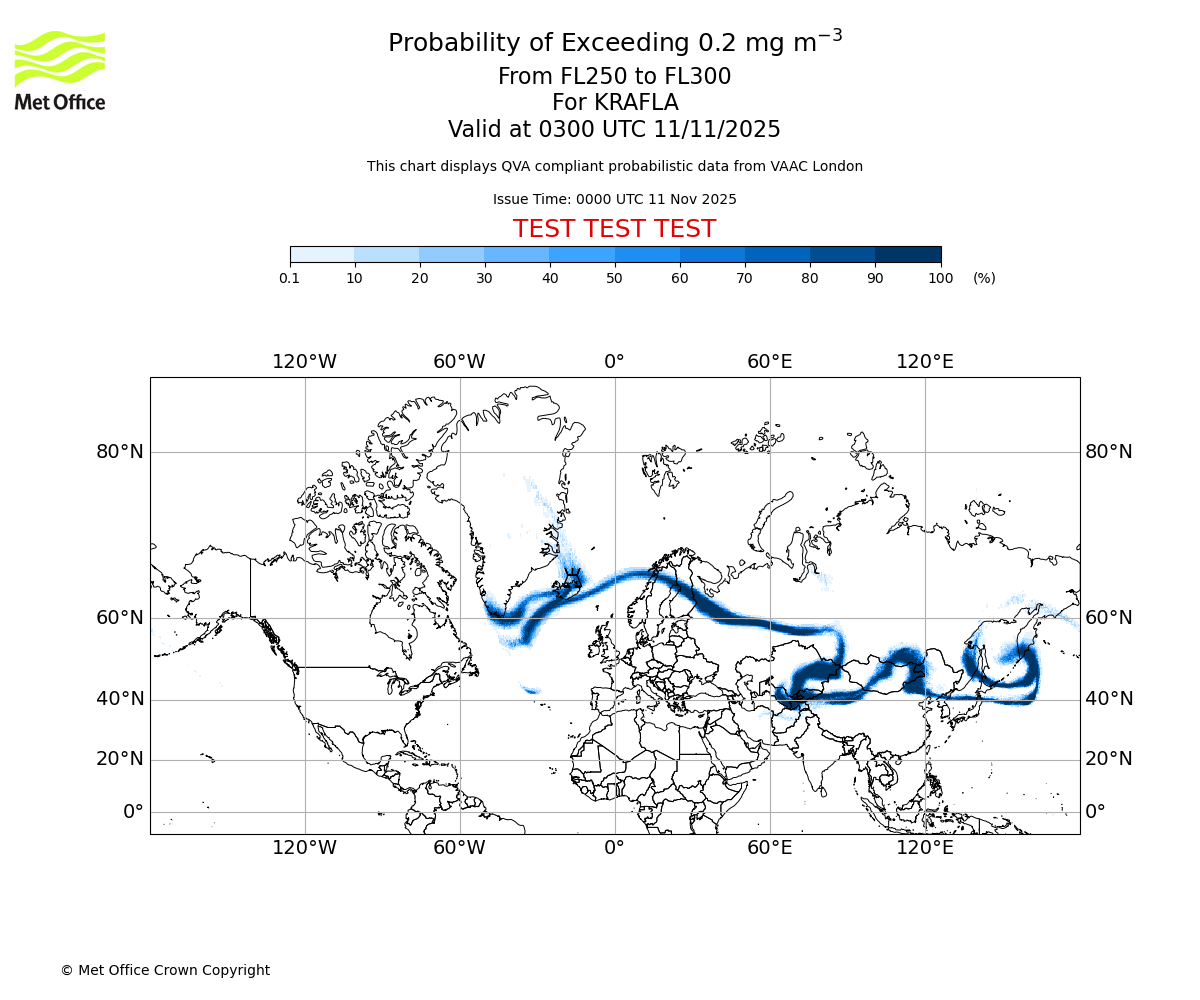 In accordance with ICAO Annex 3, Amendment 82 VAAC London will provide operational QVA forecasts from 27 November 2025 and these will be made available via a VAAC London QVA API information service. These charts are currently provided for test and evaluation purposes (not for operational use) until the introduction of the operational service.