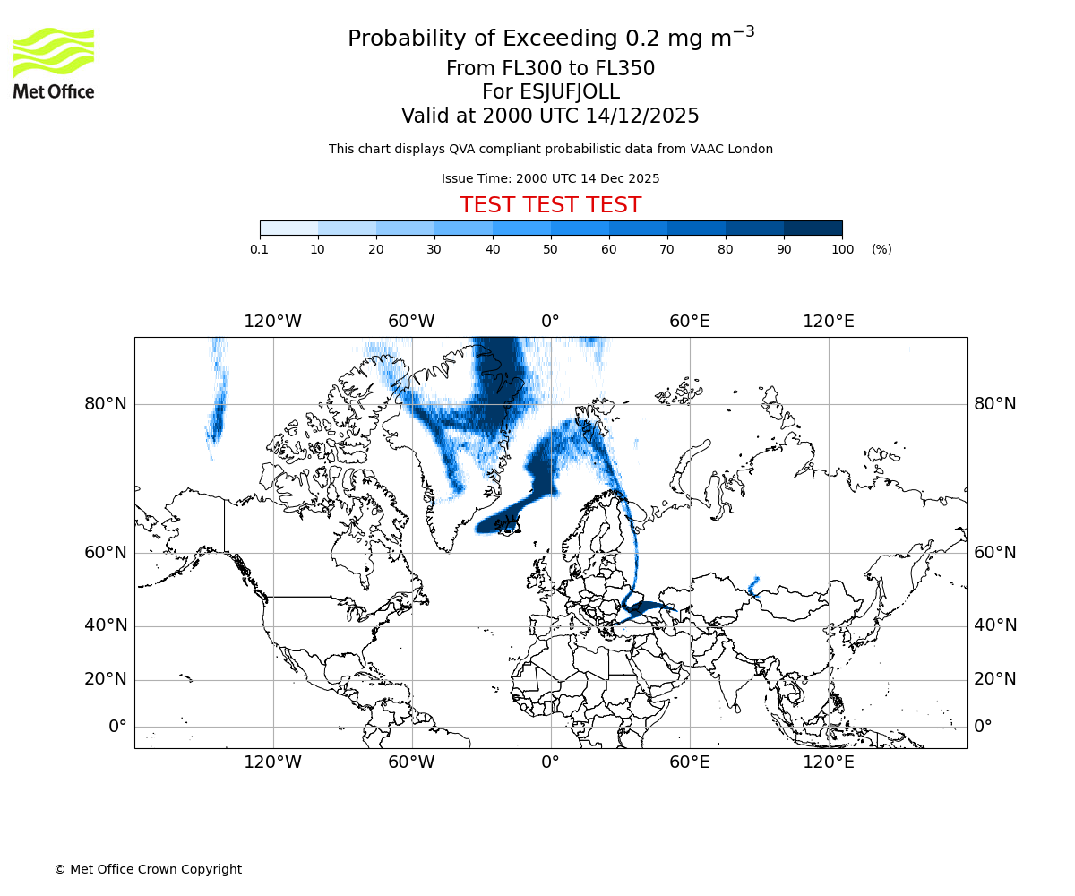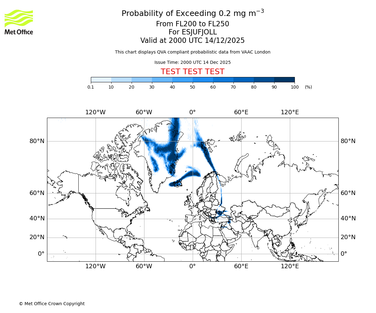 Modelled ash concentration from 000 to 200 for ESJUFJOLL. Valid at 2000 UTC 14/12/2025