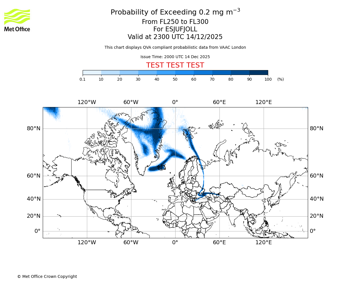 Quantitative Volcanic Ash charts (QVA) are produced in accordance with International Civil Aviation Organization (ICAO) Annex 3 requirements and are provided as well as the London Volcanic Ash Advisory Graphics (VAG) and Advisories (VAA). The lowest QVA threshold (0.2 mg/m³) matches to the areas depicted in the VAA and VAG. Both expected ash concentration and probabilistic forecast information is provided in the chart viewer below for eruptions occurring in the London Volcanic Ash Advisory Centre (VAAC) area of responsibility.