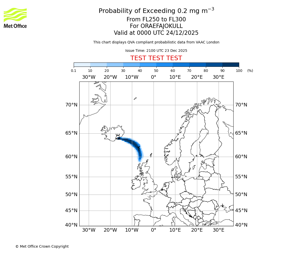 Probability of exceeding 0.2 milligrams per metre cubed. From 250 to 300 for ORAEFAJOKULL. Valid at 2100 UTC 23/12/2025